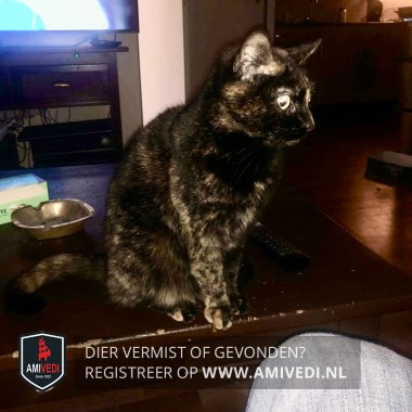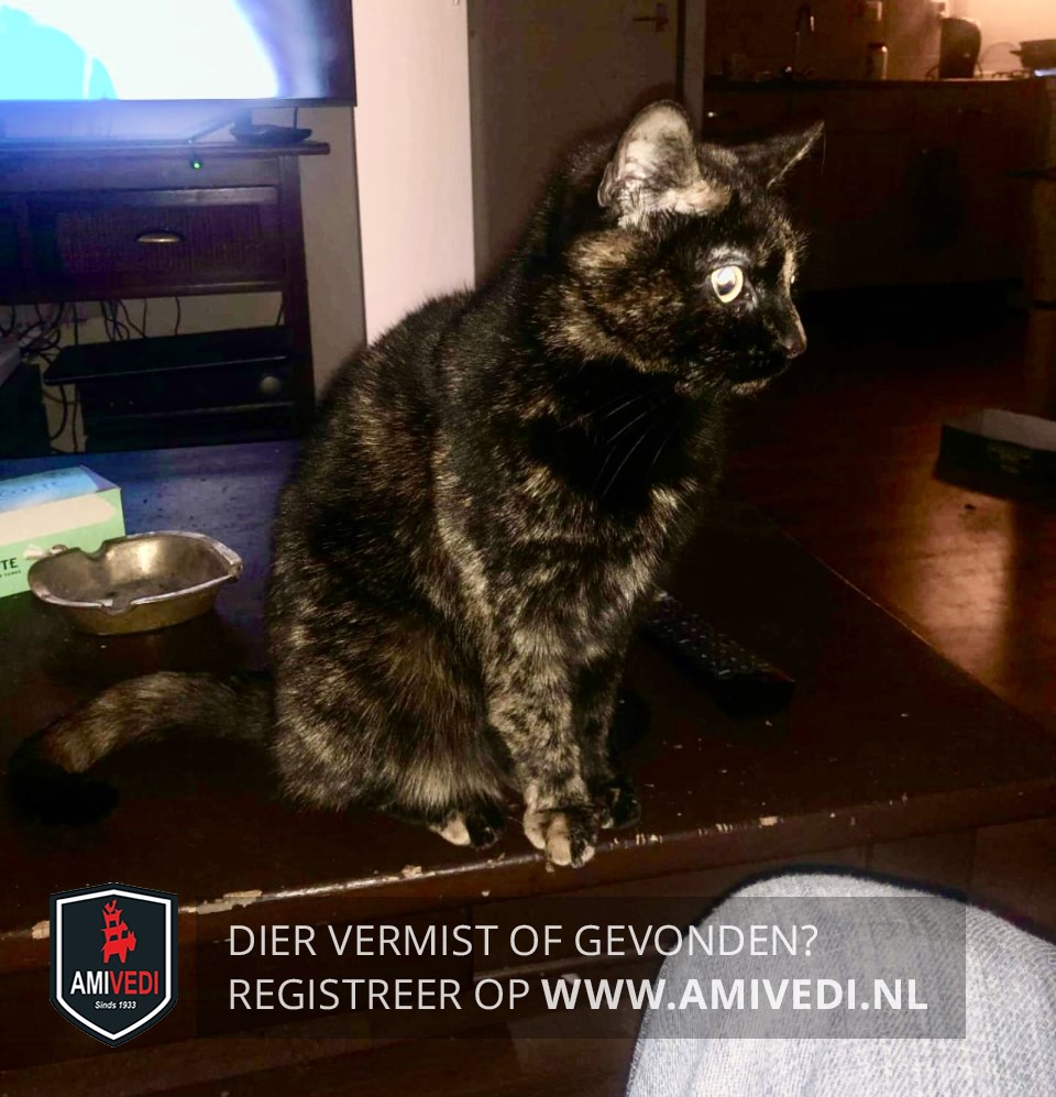 | Signalement | Schildpad poes. Zwart met rood gemêleerd. Rechts achter en voor rood teentje. |