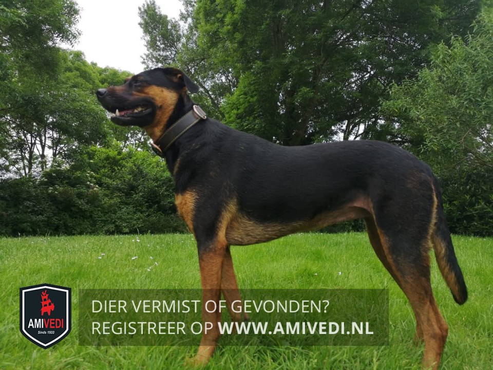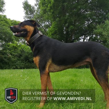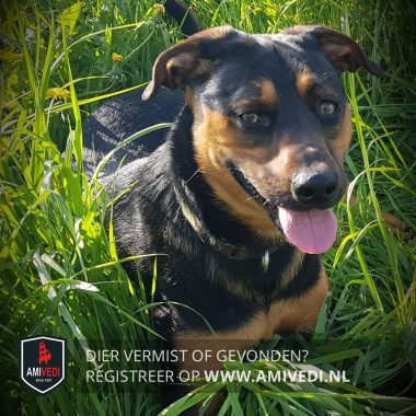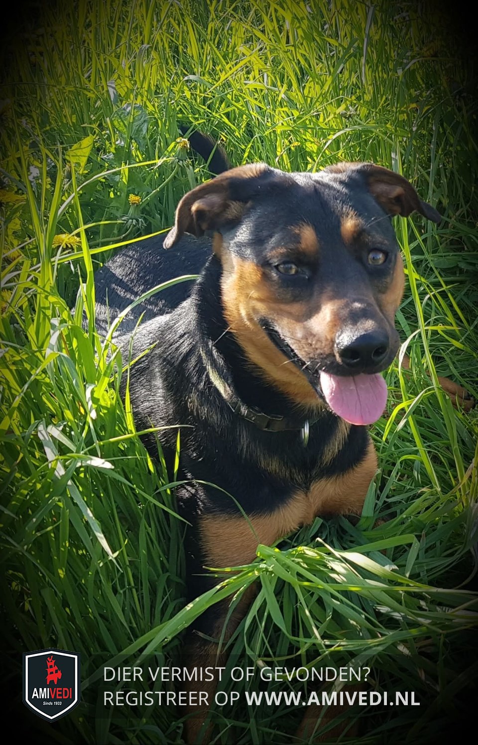 | Signalement | Kruising. Zwart bij de oren en voorhoofd. Bruine wenkbrauwen. Op de neus zwart. Wangen bruin. Kin zwart. Bef bruin. Borst en buik bruin. Voorpoten bruin en achterpoten bruin tot over de knie. Rug en staart zwart. Onderkant staart bruin. |