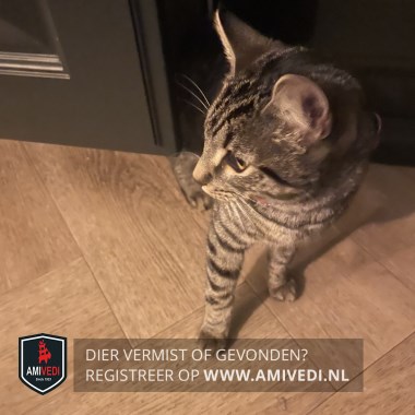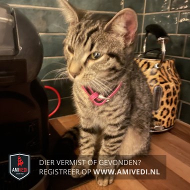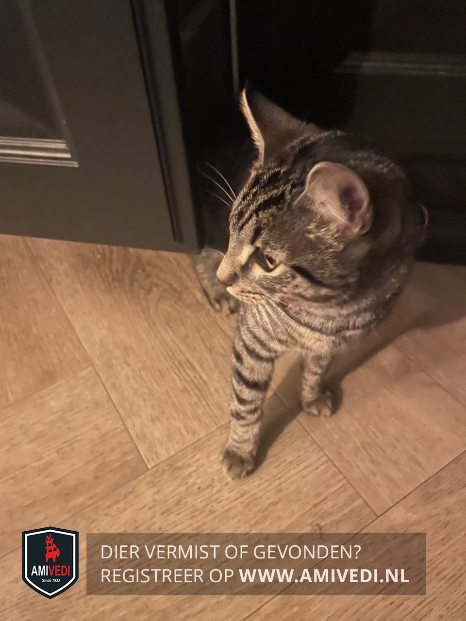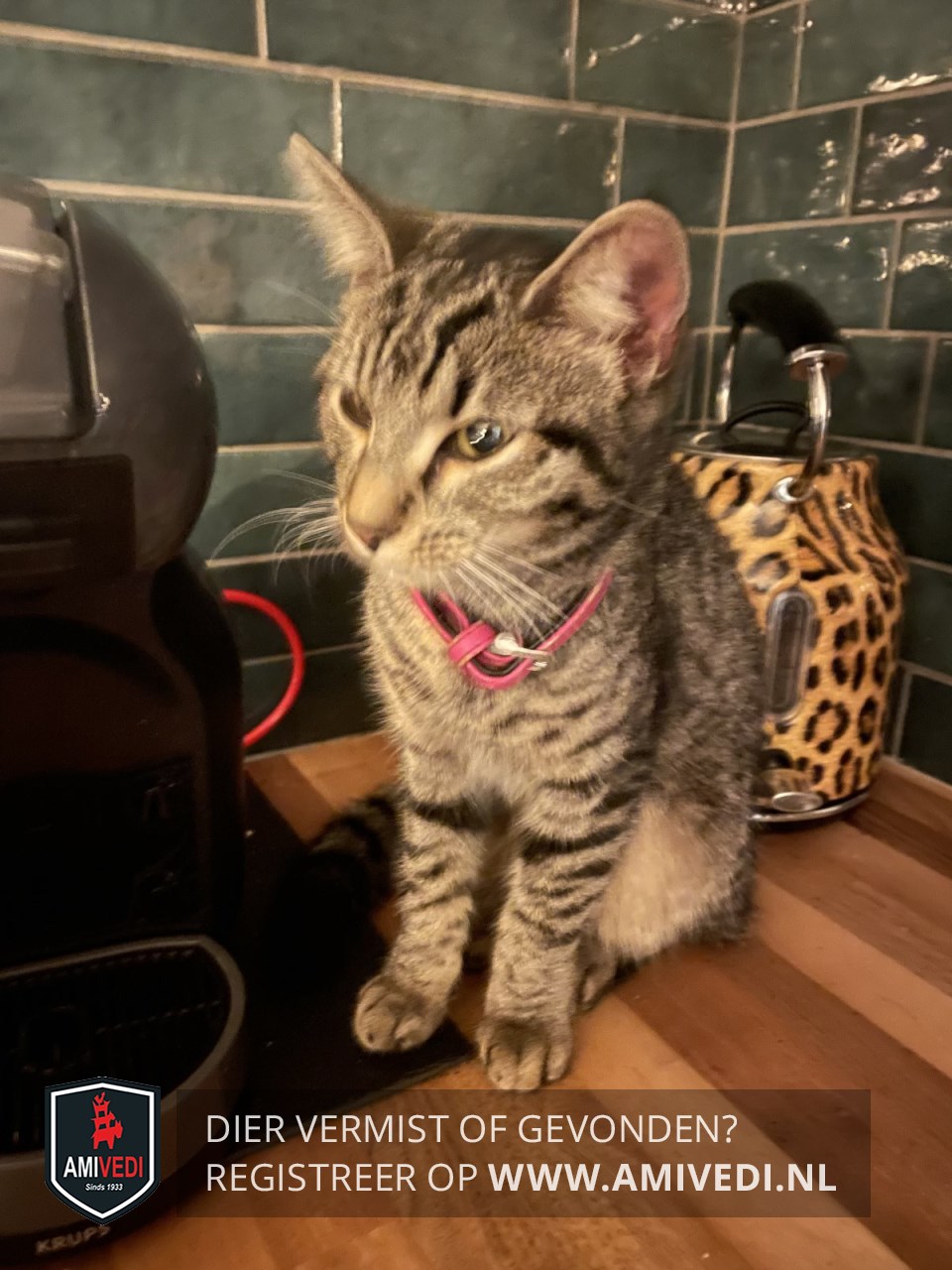 | Signalement | Kleine grijs/zwart cyperse kat. Beige op de buik. Roze halsbandje. |