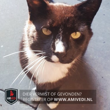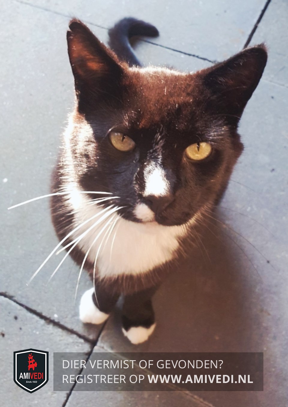 | Signalement | Zwart-witte kater. Wit rondje op de rechter lip. Witte bef en witte voetjes. Heeft groen-gele ogen |