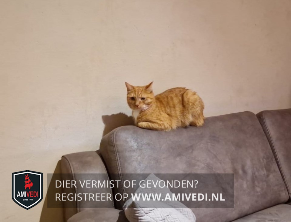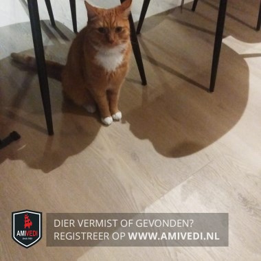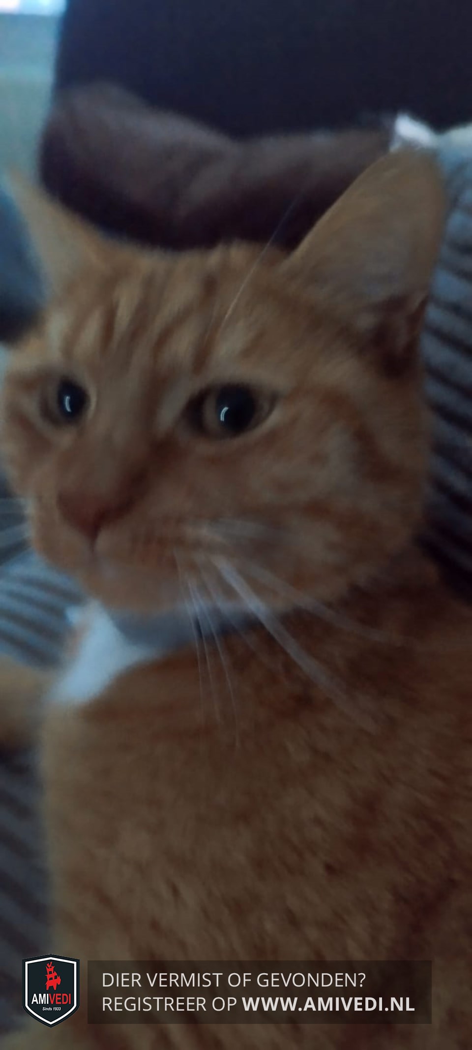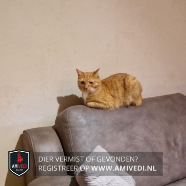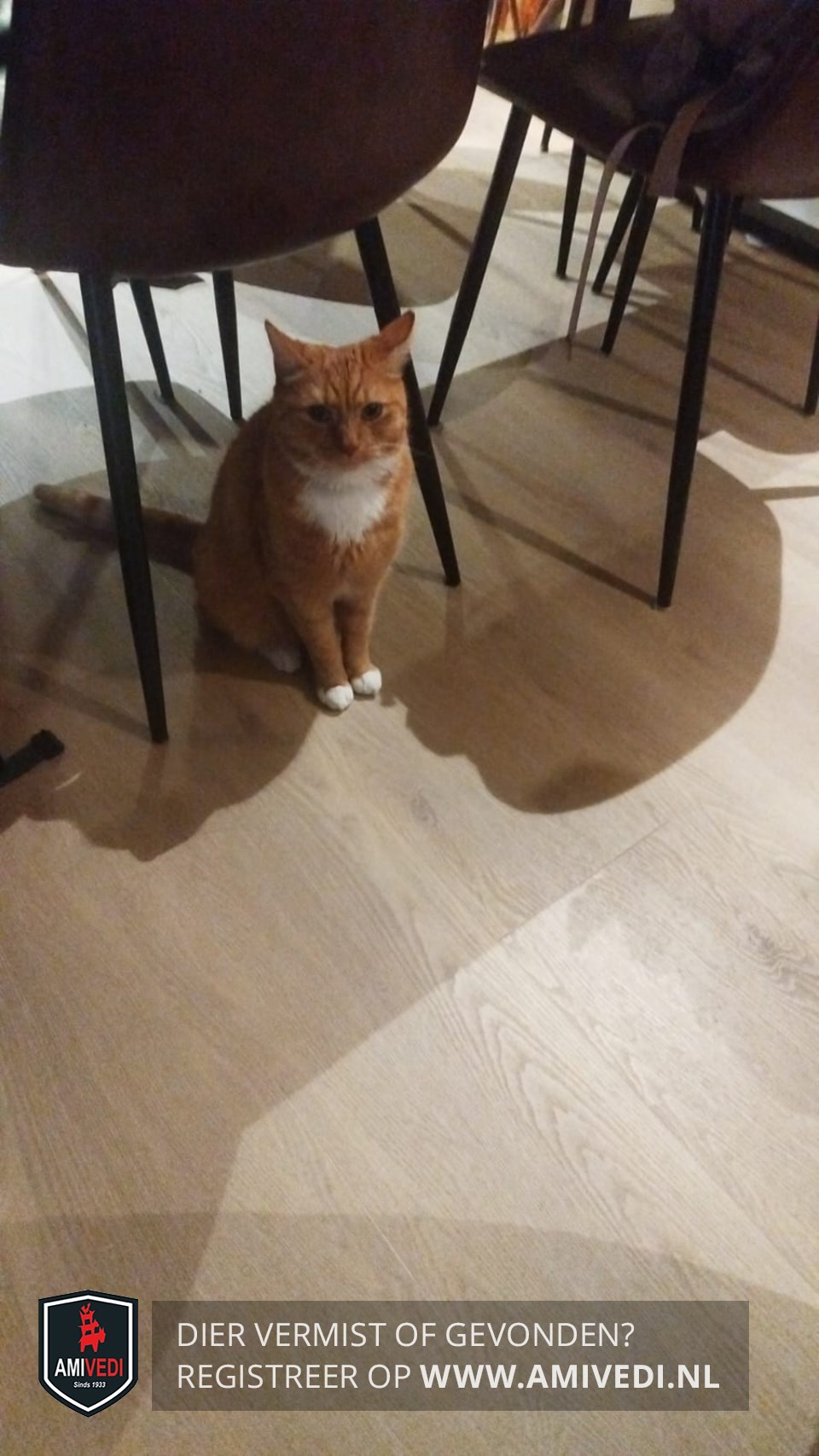 | Signalement | Cypers rood gestreept, witte hals/bef, voorpoten witte tenen. Lief klein katertje Lio, beetje bangig. |