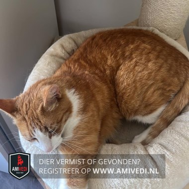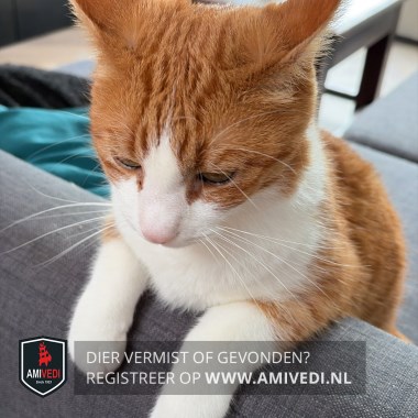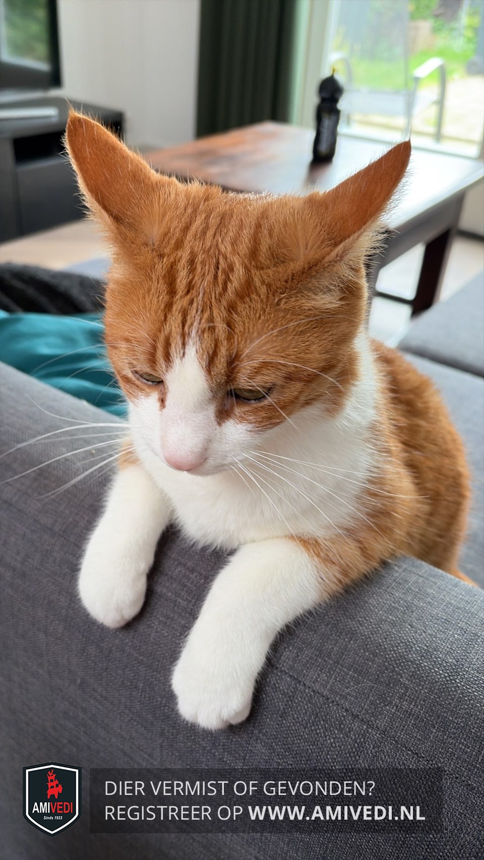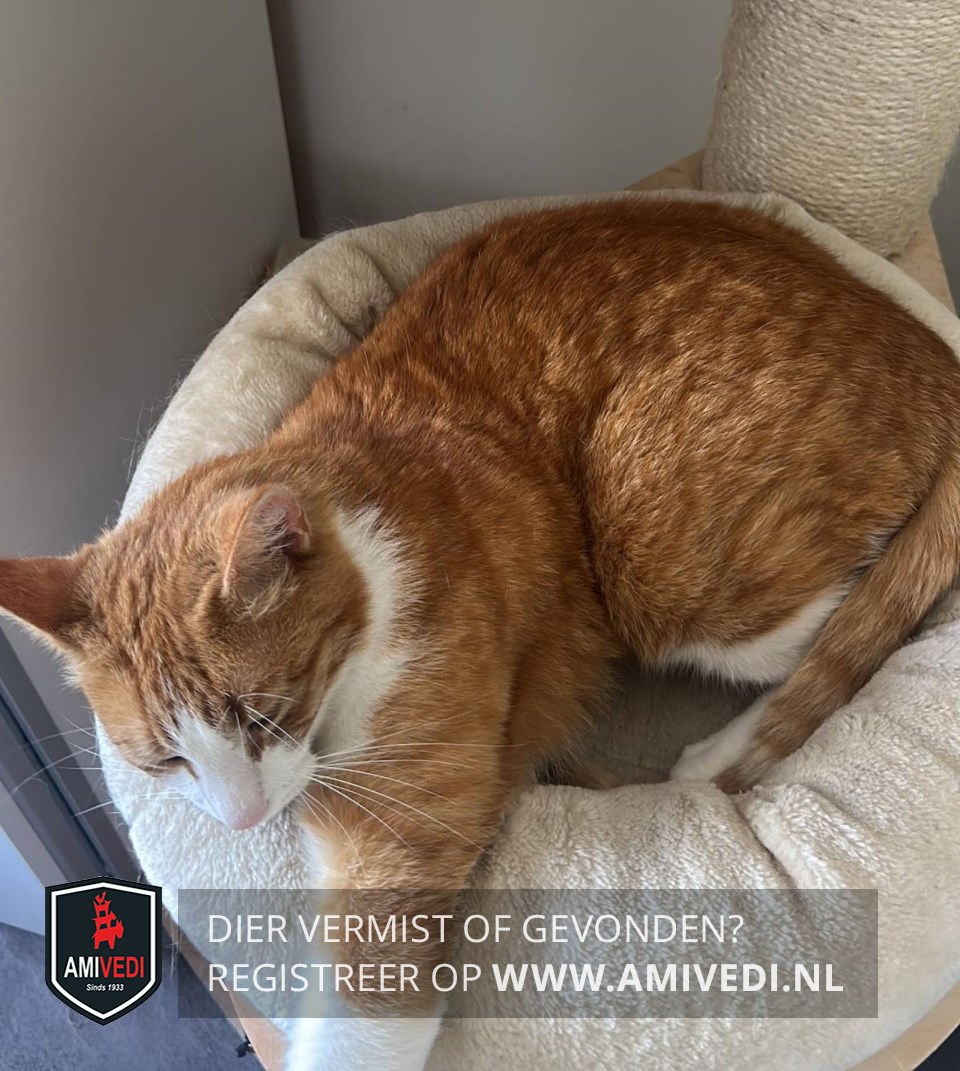 | Signalement | Cypers rood met witte snuit, witte kin, nek, bef, borst en buik, voorpootjes witte laarsjes en witte achterpootjes, in het rechteroor een snee/wond, stevige kater. |