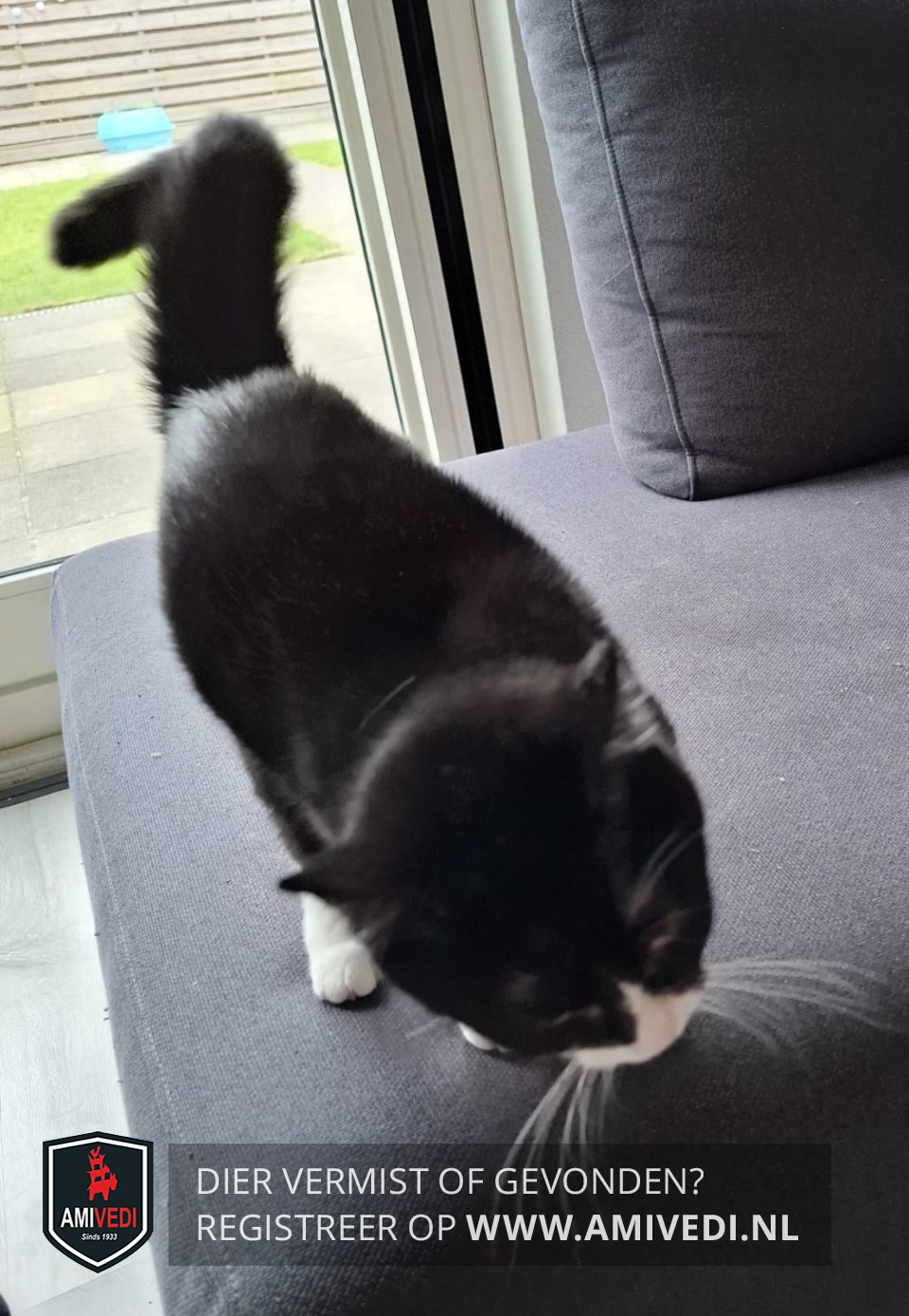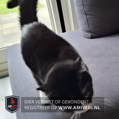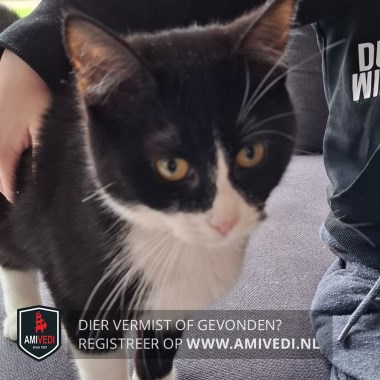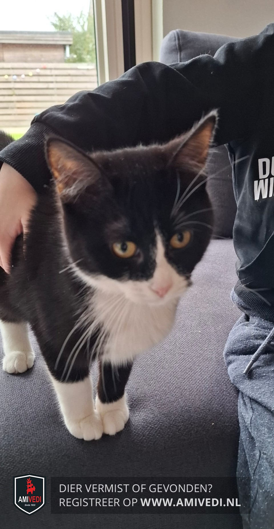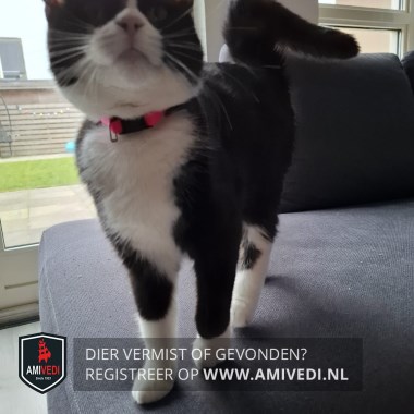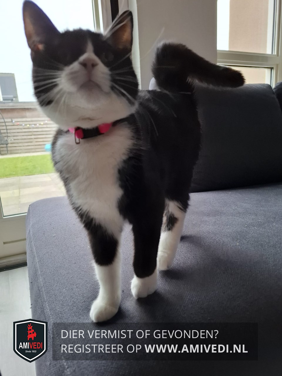 | Signalement | Zwart/witte kat met een dun wit streepje tussen haar ogen en wit op haar wangen. Witte borst. Aan het linker voorpootje een wit voetje en aan de andere poten witte sokken. Geen halsbandje meer om |