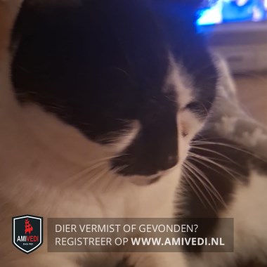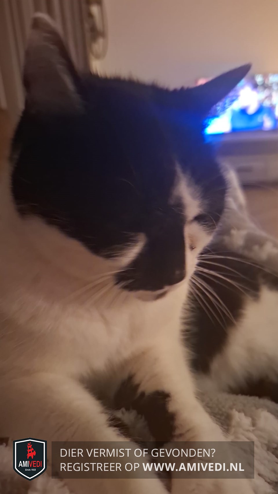 | Signalement | Wit met zwart Overwegend zwarte kop met op het rechteroor een wit vlekje op het uiteinde, zwarte snoet met witte lijn vanaf voorhoofd aan de linkerzijde dat uitloopt over het oog naar de wang en onder de neus door als een oneven witte snor naar een piek die tot aan de binnenhoek van het rechter oog loopt, witte borst, witte voorpoten met aan beide voorpoten aan de binnenzijde een zwarte vlek boven de pols, witte buik, zwarte vlek op de rug, witte achterpoten. |