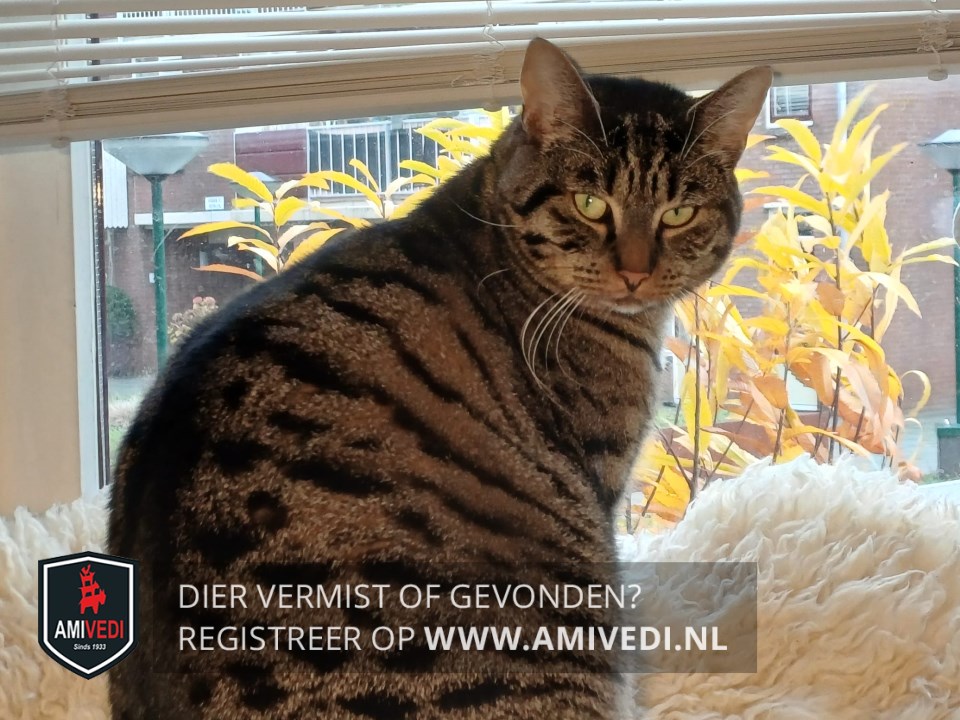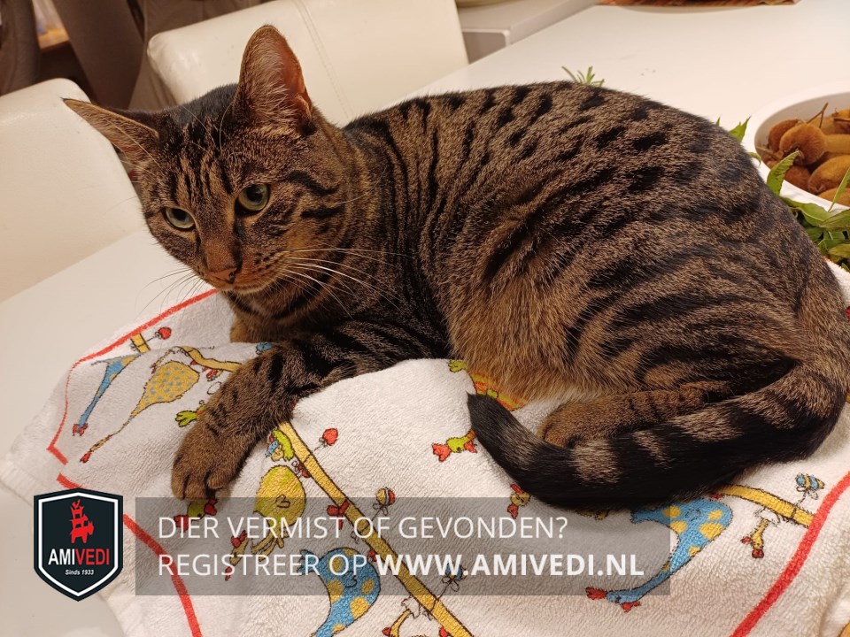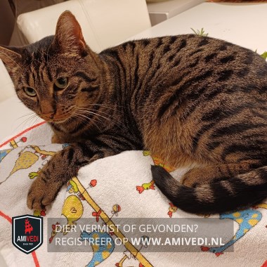 | Signalement | Cypers bruin/zwart gestreept en gespikkeld, groene ogen, gestreept in het aangezicht, poten en staart, zwarte streep over de rug, zwarte spikkels (spots) en strepen over het lijf, klein wit plekje op de onderbuik. |