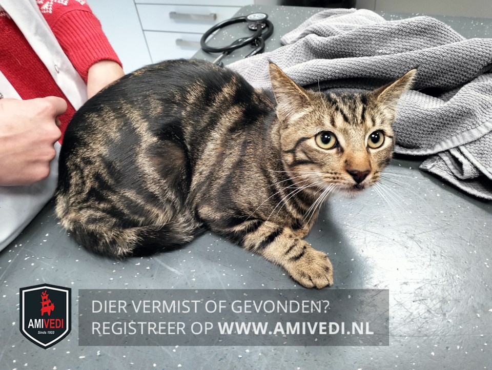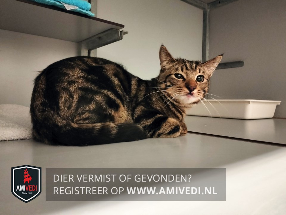 | Signalement | Cypers bruin/zwart gemarmerd, lichte kin. |