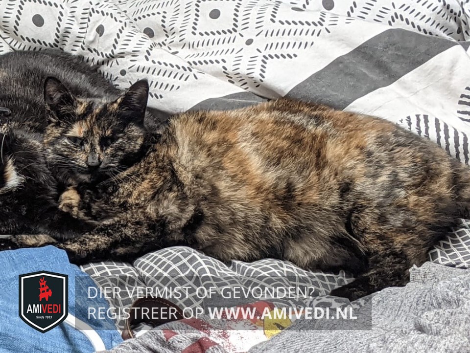 | Signalement | Roodbruin/zwart/beige gemêleerde schildpadpoes. Donker gezichtje. |