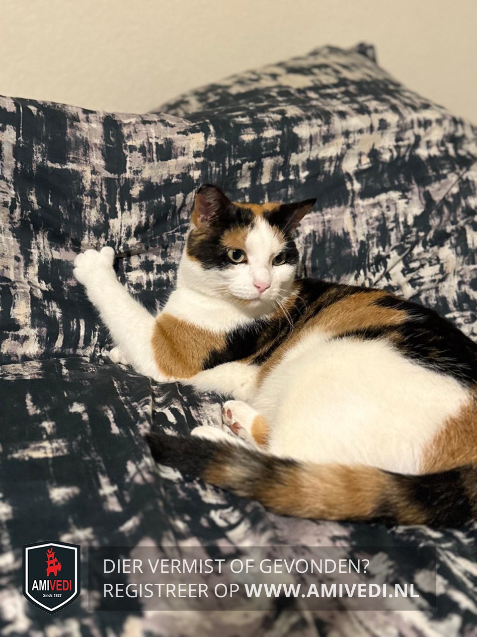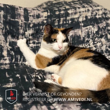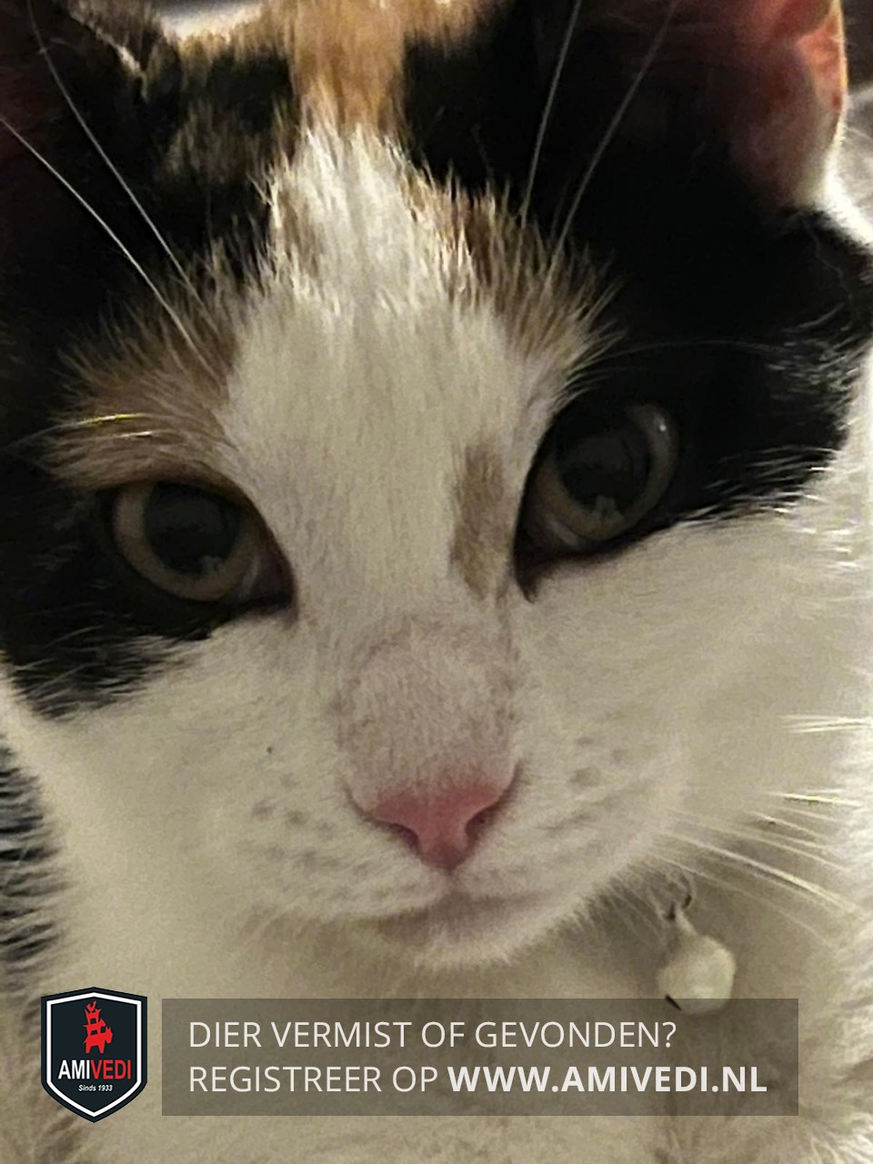 | Signalement | Wit/rood/zwarte Lapjeskat. Witte snoet, bles, bef en borst. Vanaf de ogen en op de kop gevlekt. Gevlekte rug en staart. Witte poten. |