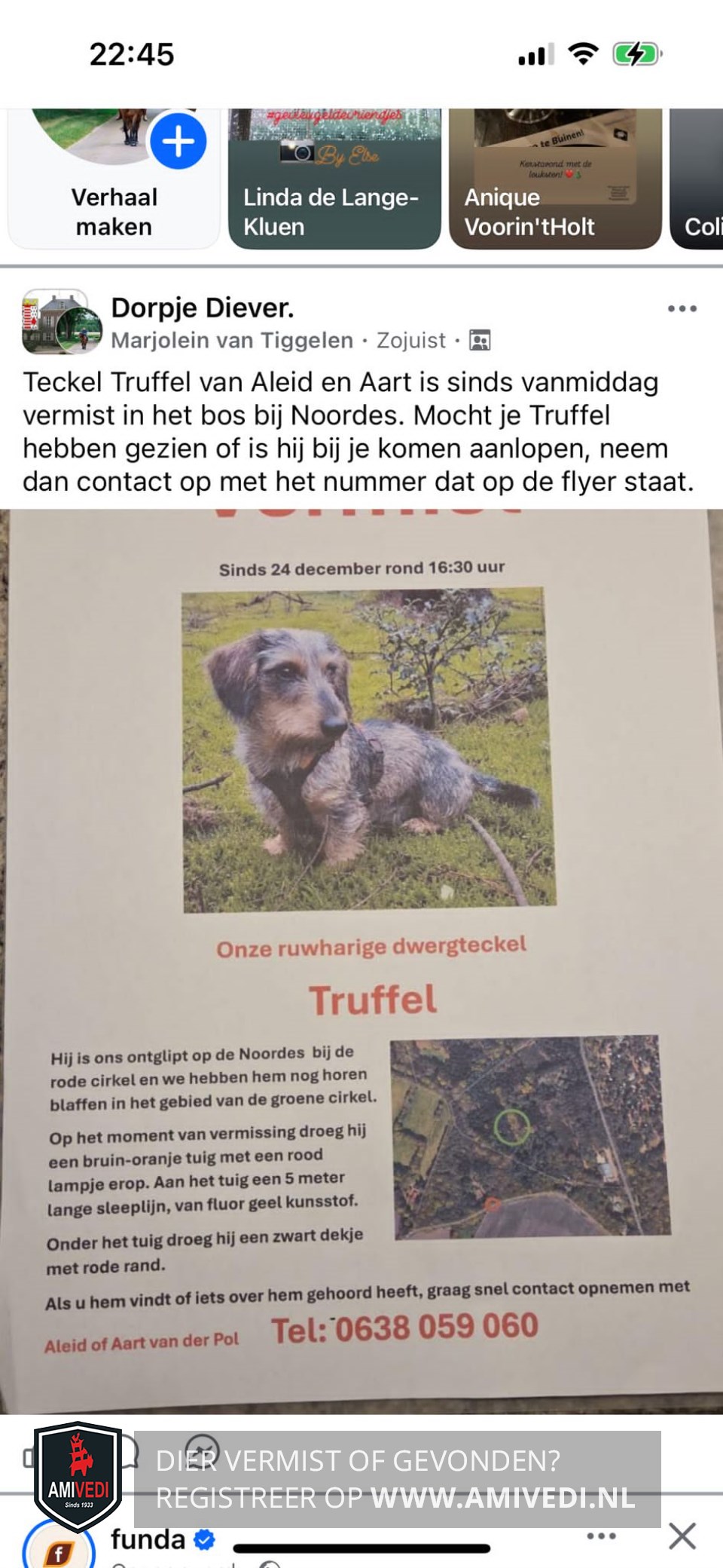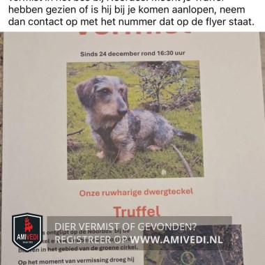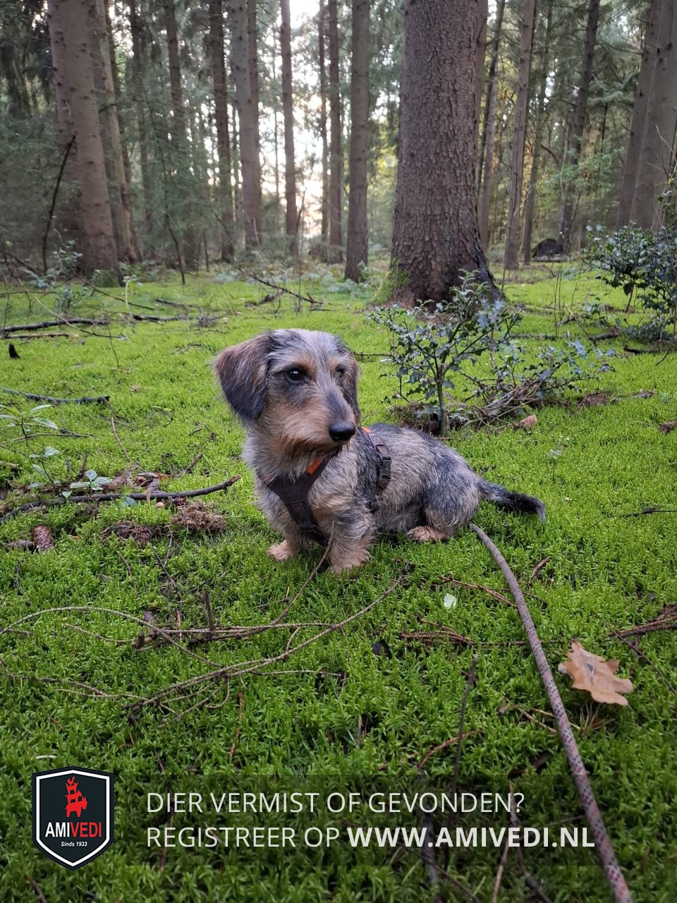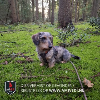 | Signalement | Ruwharige dwergteckel. Bruin/zwart/grijs gemêleerd. Oranje-bruin tuig en zwart dekje met rode rand aan. Sleeplijn van 5 meter, fluor geel. |