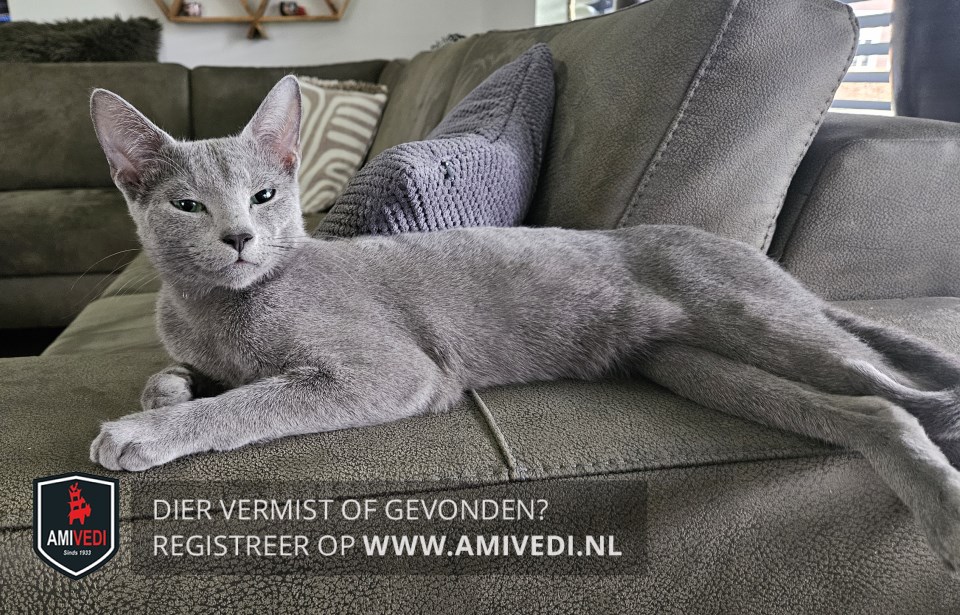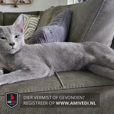 | Signalement | Geheel grijs van kleur en heeft groene ogen. |