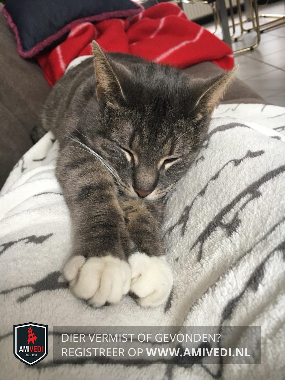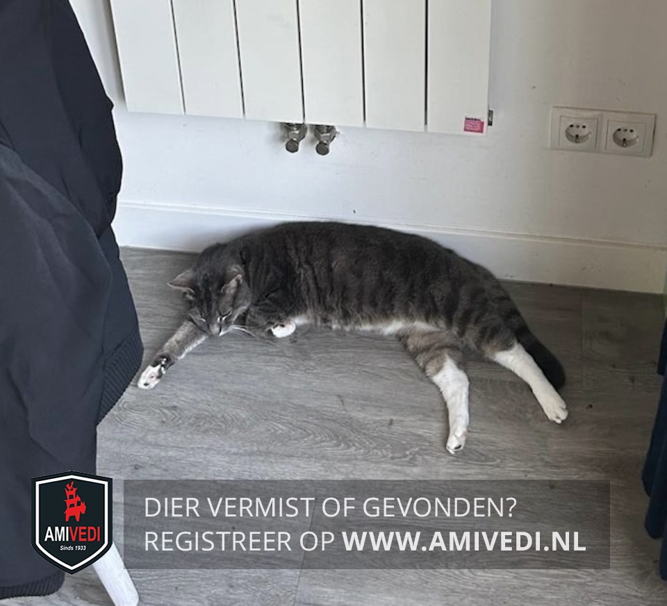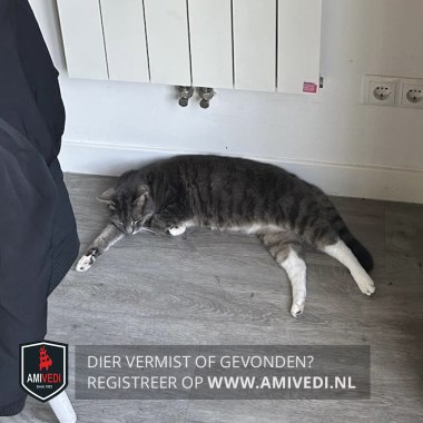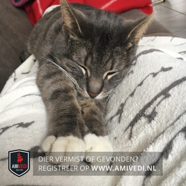 | Signalement | Cypers grijs-zwart, wit op buik, voorpootjes witte voetjes, witte achterpoten, grijze vlek onder op linker achterpoot. |