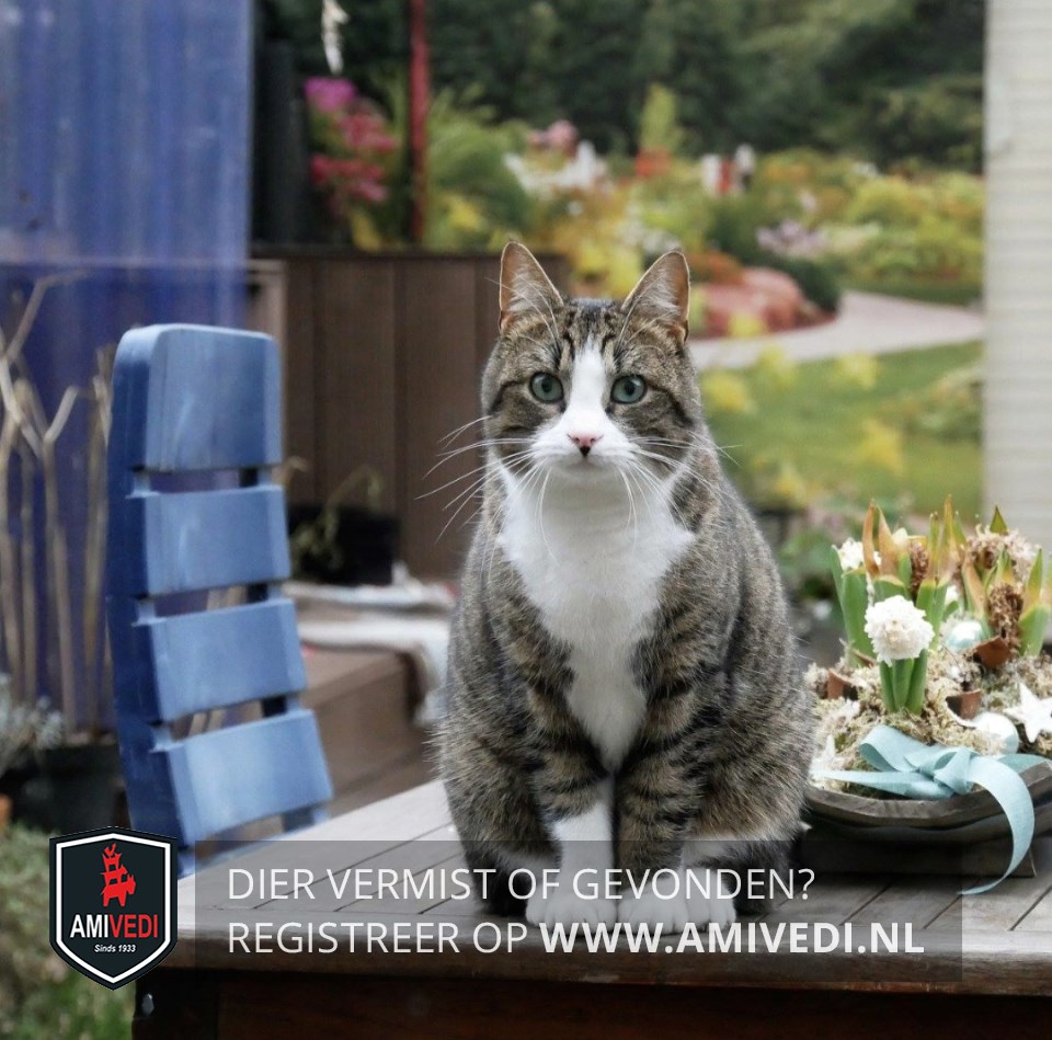 | Signalement | Cypers grijs - zwart met wit, cyperse oren en kopje, witte bles en snuit, klein zwart plekje onderaan de neus, witte kin en borst loopt door tussen de voorpoten, cyperse voorpoten met links een wit sokje en rechts witte kous, klein zwart hartje op de rechterachterpoot, cuperse rug, mist een hoektand links boven. |