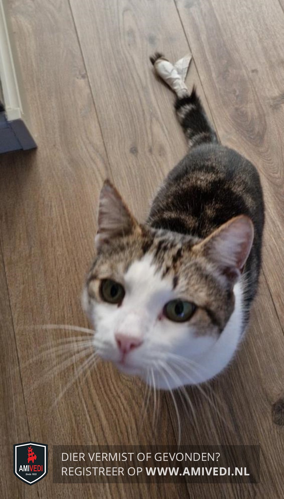 | Signalement | Cypers grijs zwart gestreept met wit Witte voorhoofd over de neus aflopend in witte snoet, witte kin, witte borst, witte voorpoten, witte buik. Mist links achter het pootje en heeft... een pleister of verband om het einde van de staart |
