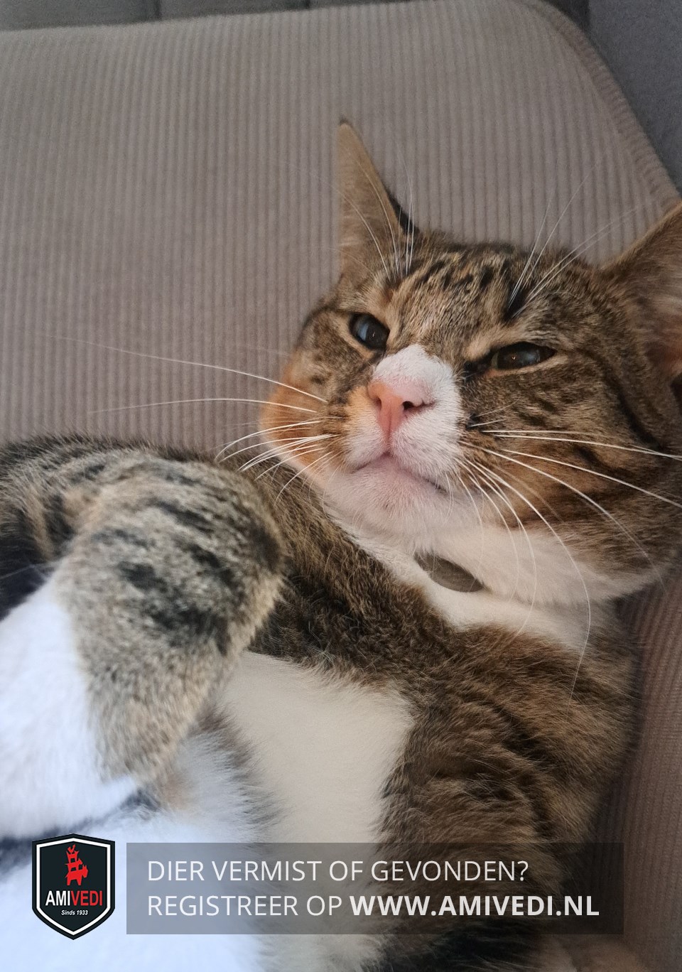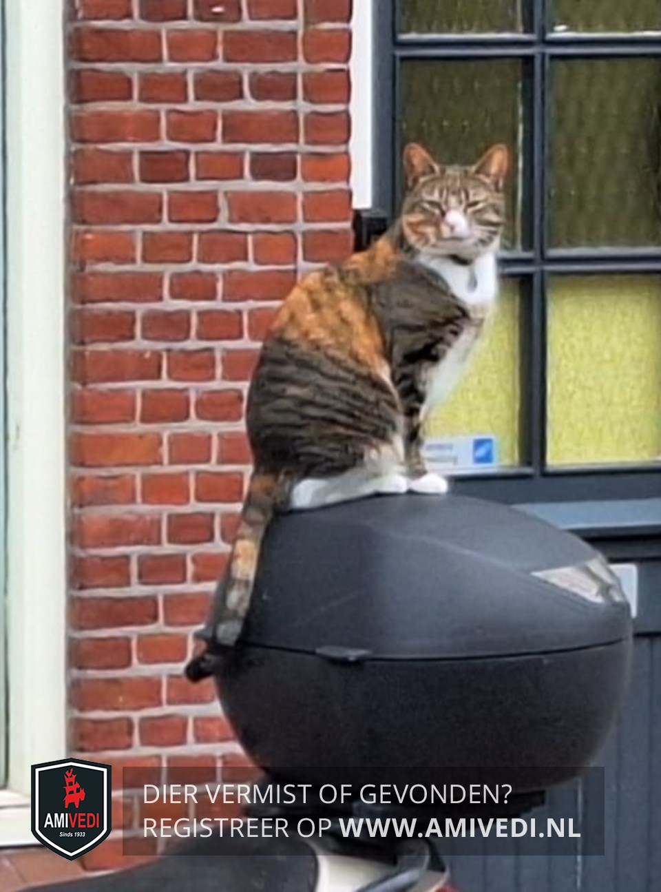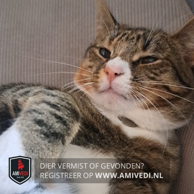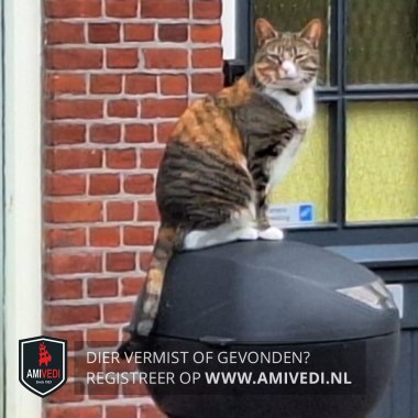 | Signalement | Ze heeft cyperse strepen zwart/bruin en oranje tinten door haar vacht. De strepen lopen door op haar voor pootjes. Ze heeft een halsband om met daarbij een munt waar haar naam en telefoonnummer op staat. |