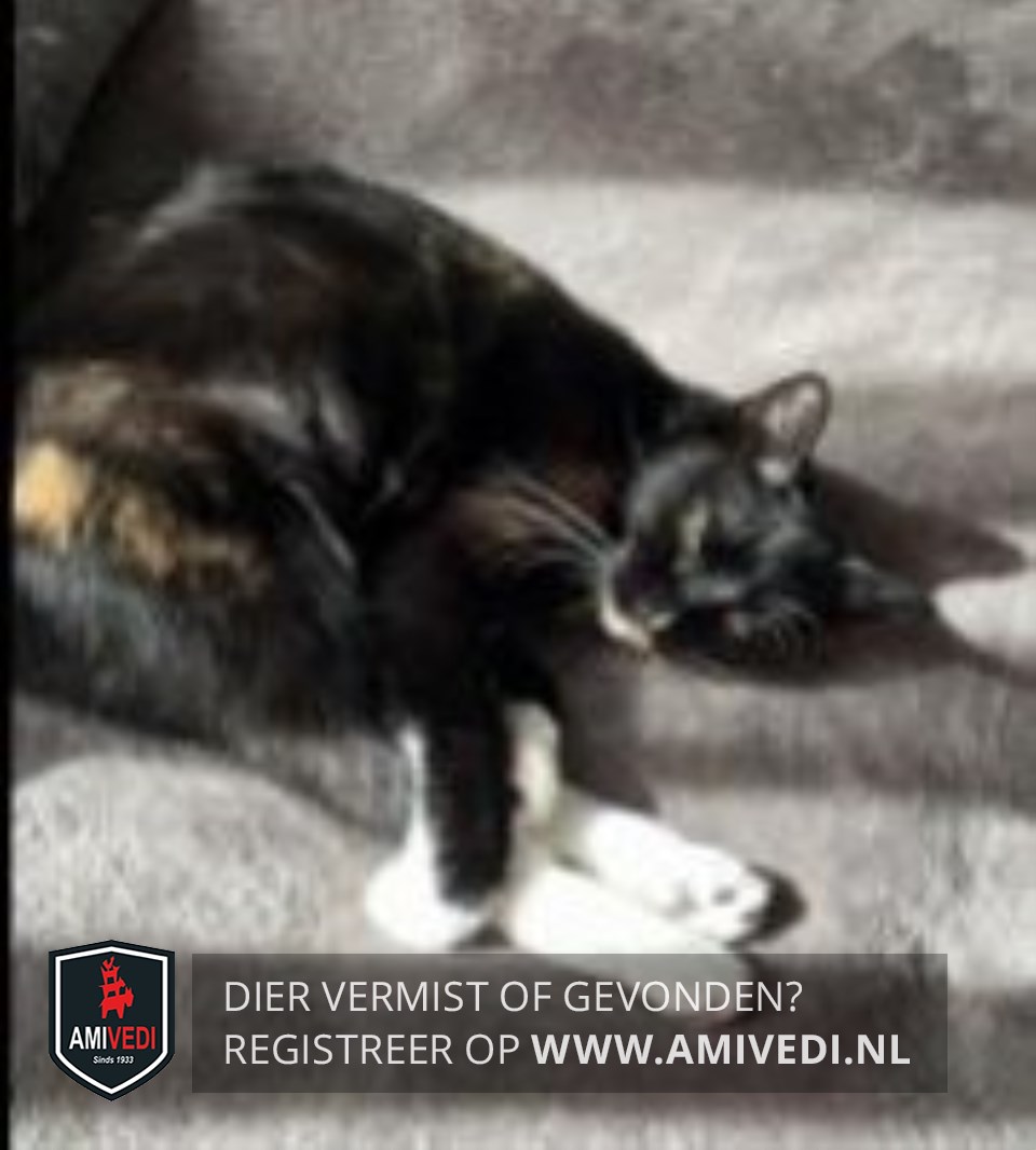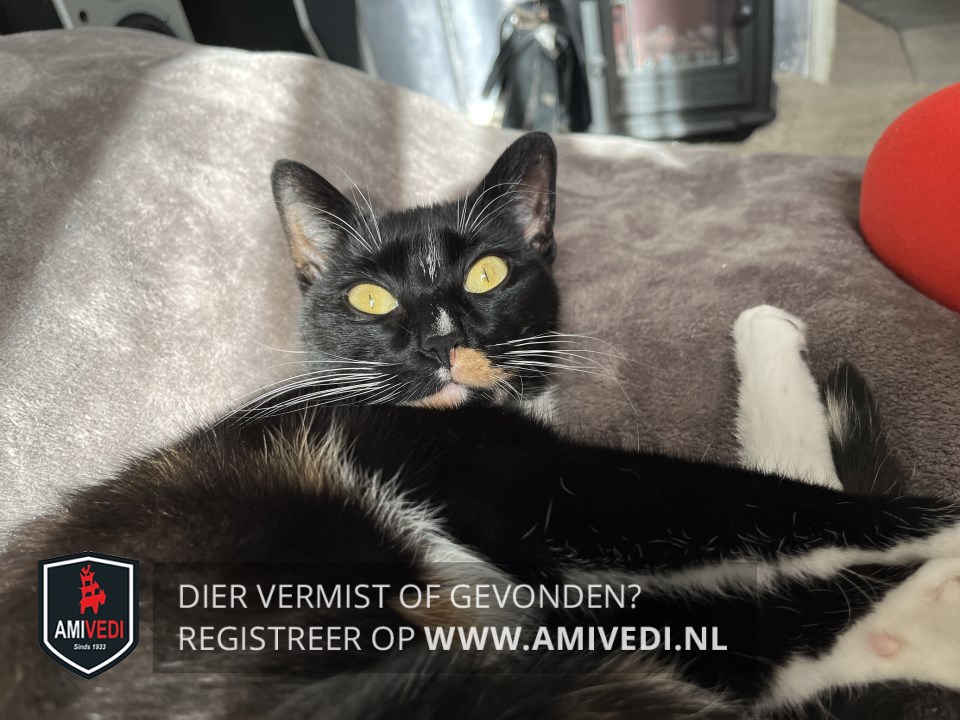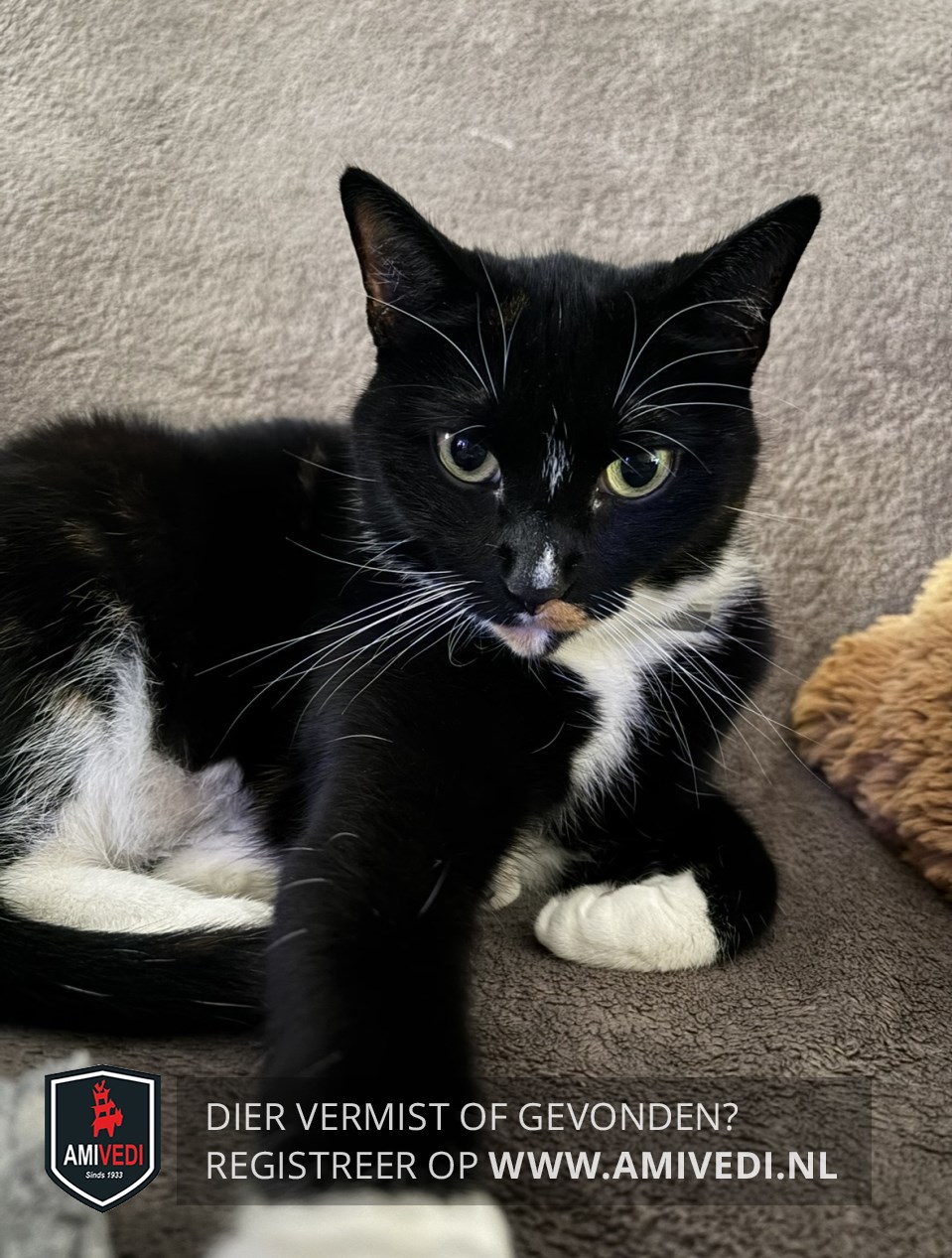 | Signalement | Zwart. Witte borst, buik en 4 witte sokjes. Wit streepje op de neus en klein streepje op de neusbrug. Linker kant van de bek een rood/oranje plekje. Boven op de rechter poot een rood/oranje plek. |