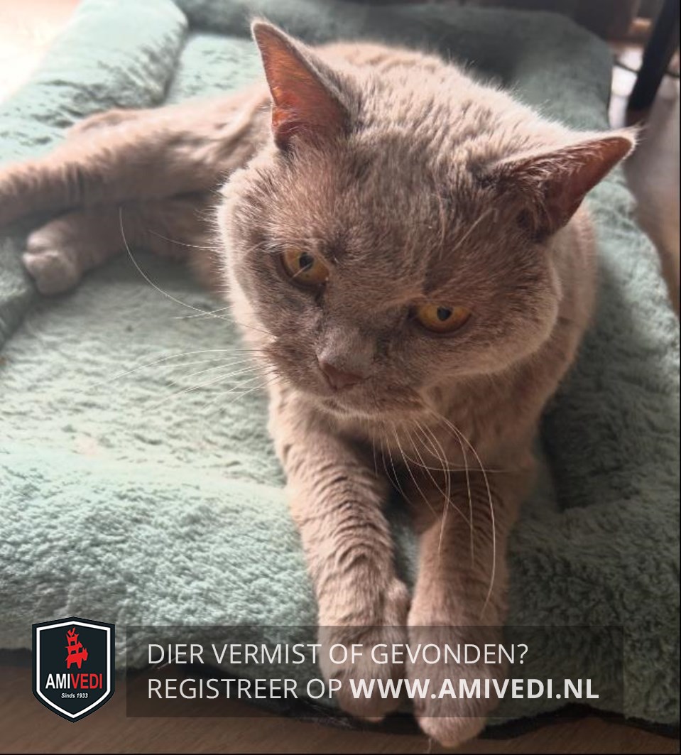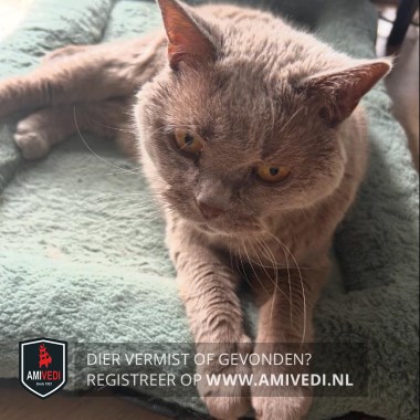 | Signalement | Grijze vacht (lilac), oranje ogen, zwart vlekje in rechteroog. Beweegt moeilijk, waarschijnlijk artrose. |