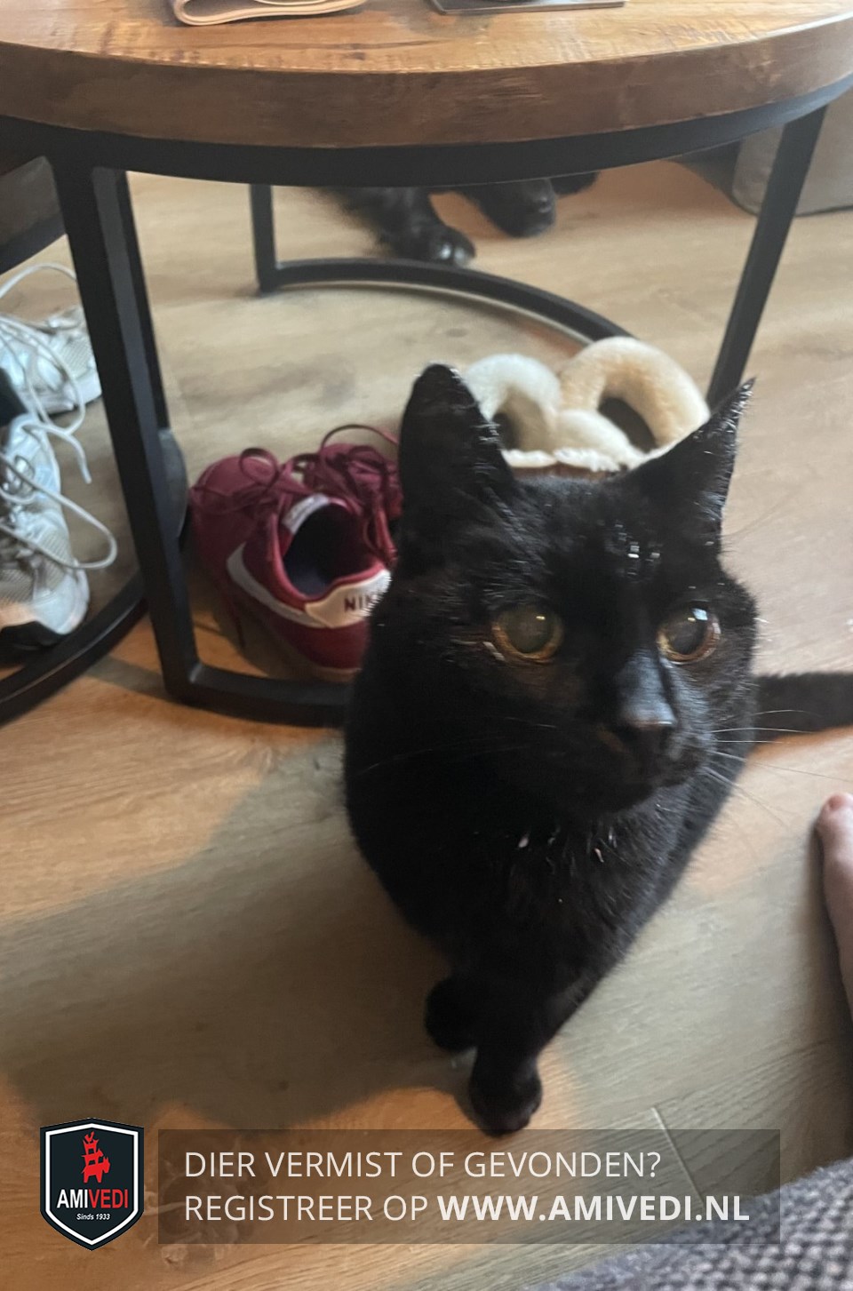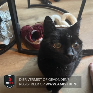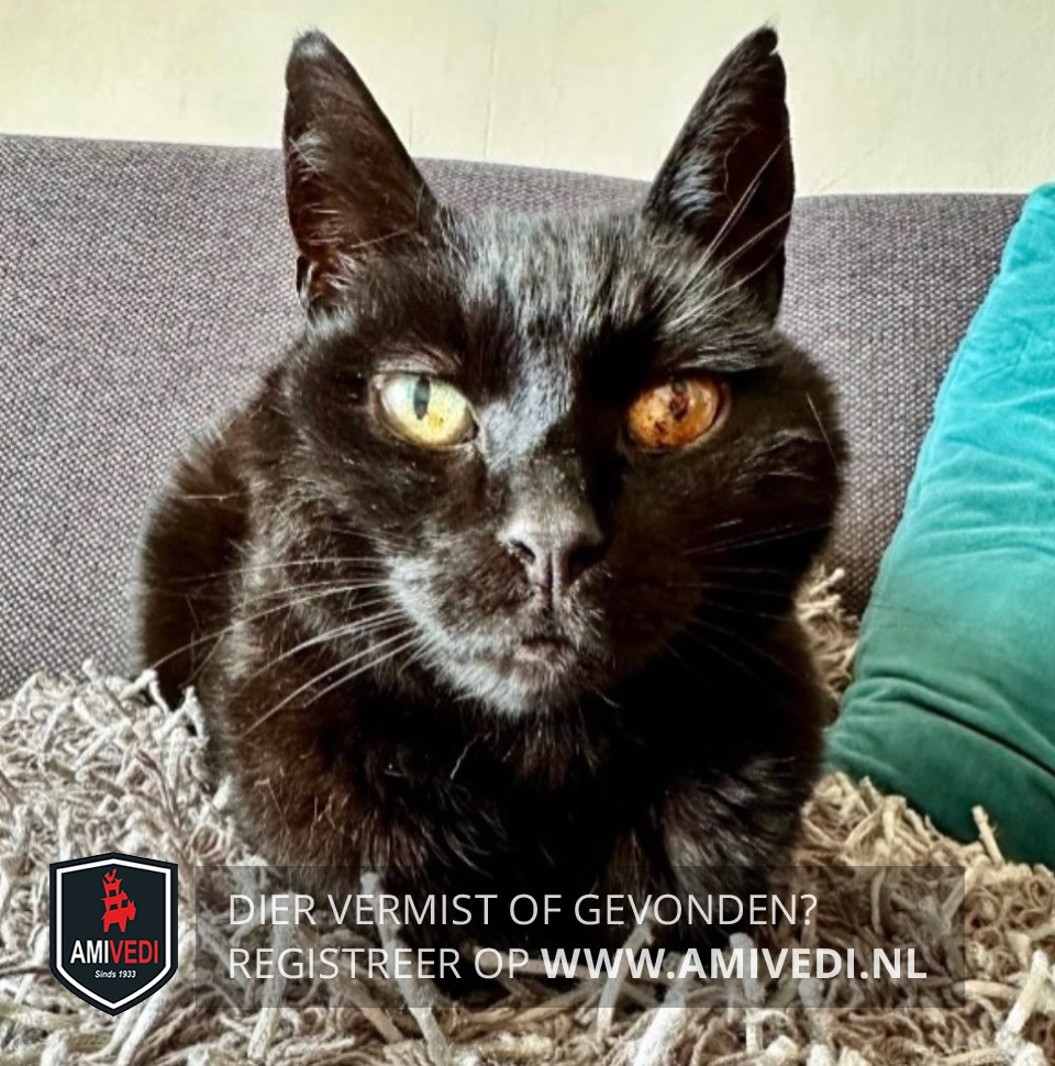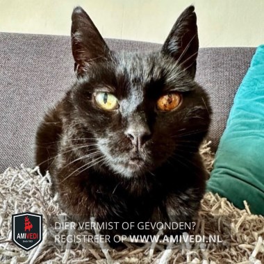 | Signalement | Een zwarte kater met geelgroene beschadigde ogen. Operatiewond (goed genezen) in nek. |