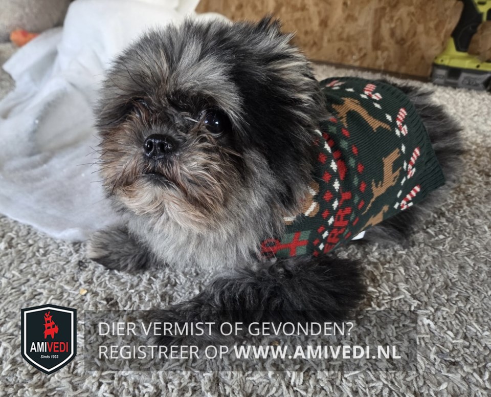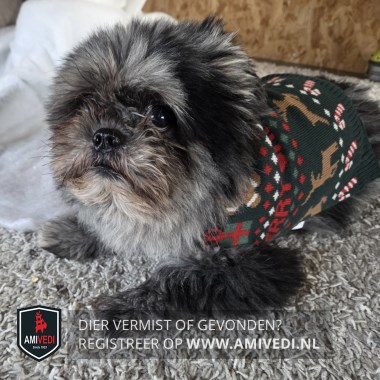 | Signalement | Kwispel is grijs met zwart rond snoetje en bruin in snoetje. Zwarte pootjes. Hij heeft een kersttruitje aan. |