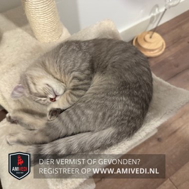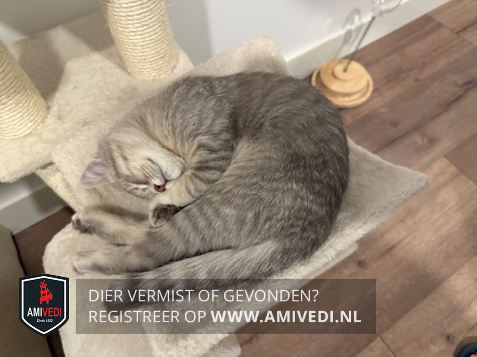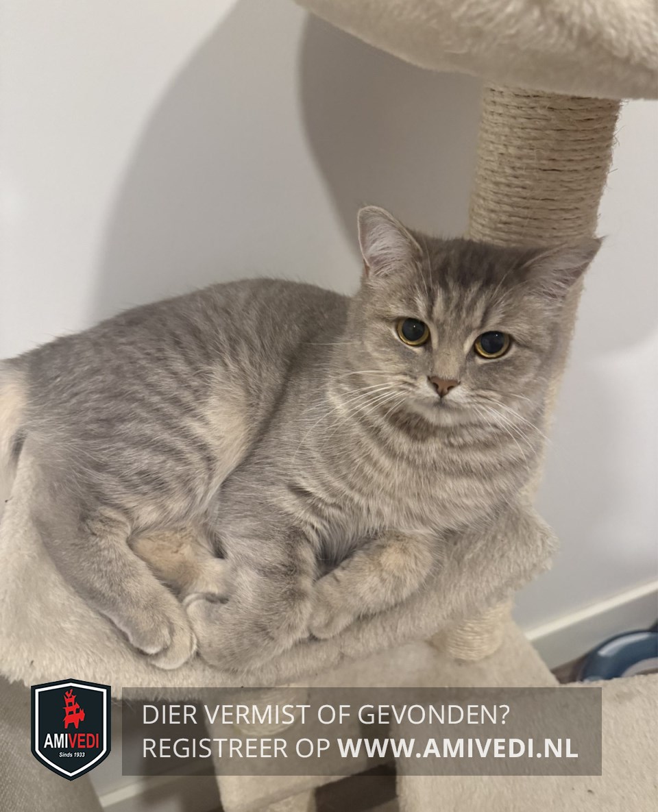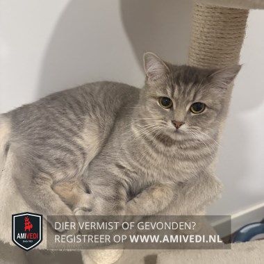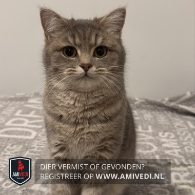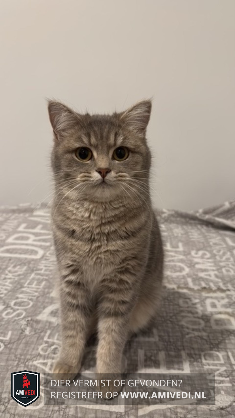 | Signalement | Brits korthaar X, beige met grijs gestreept en wit snorretje en witte kin. |