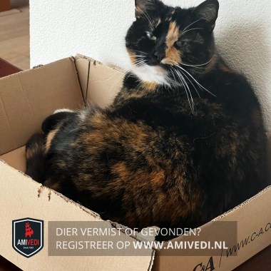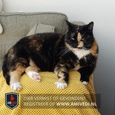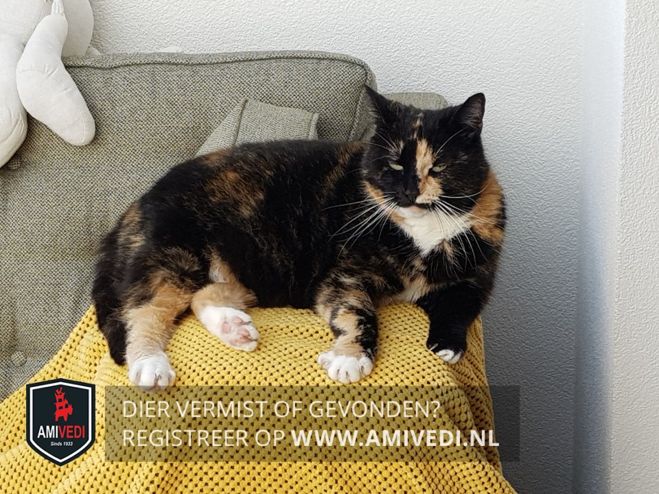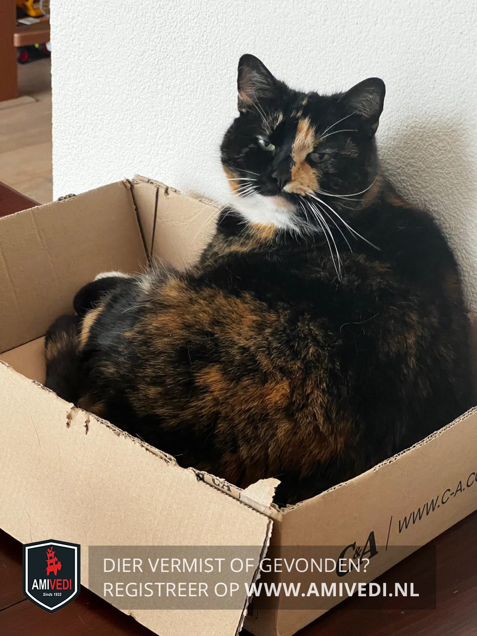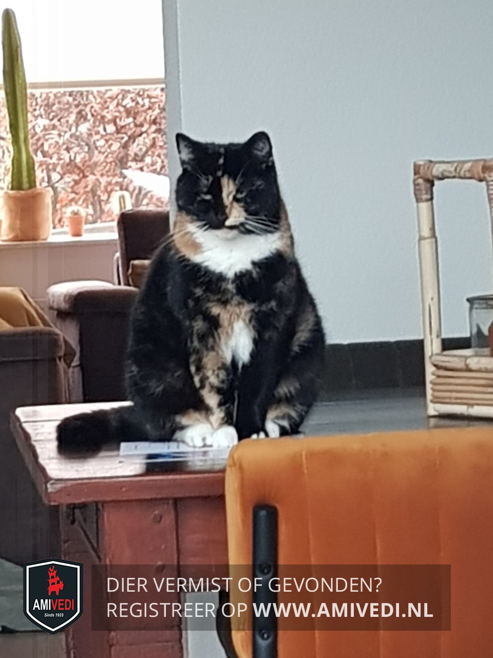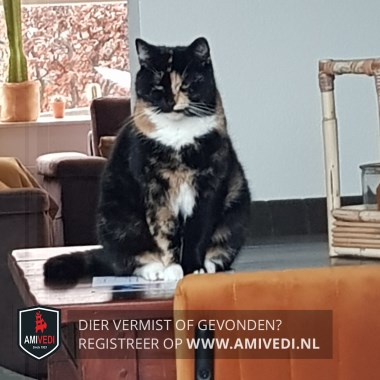 | Signalement | Schildpadpoes met een vnl zwart gezicht met tussen de neus, gedeeltelijk op de neus en het linker oog doorlopend naar de bovenlip een rode langwerpige oranje vlek, kleine oranje vlekjes op het voorhoofd en boven het rechter oog, groene ogen, witte kin met iets licht oranje onder de mond, witte snorharen en witte bef, oranje vlek aan weerszijden van de witte bef, het lichaam is zwart met rood gemêleerd, meer zwart dan rood, rechter voorpoot is rood-zwart gevlekt met witte teentjes, linker voorpoot is zwarte met iets wit op een paar teentjes, achterpoten zijn rood met rechts een wit voetje en links een witte sok, de staart is vnl zwart |