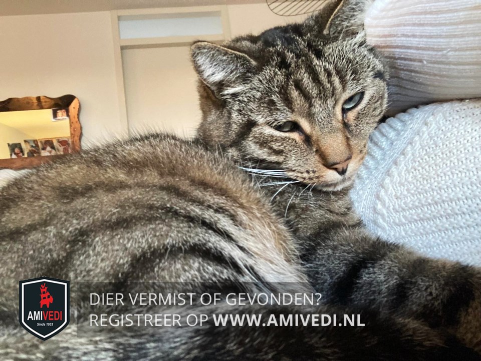 | Signalement | Cypers bruinzwart gestreept met wit. Voornamelijk cypers bruin, roze neusje met een zwart randje, onder het neusje en kin een beetje wit. |