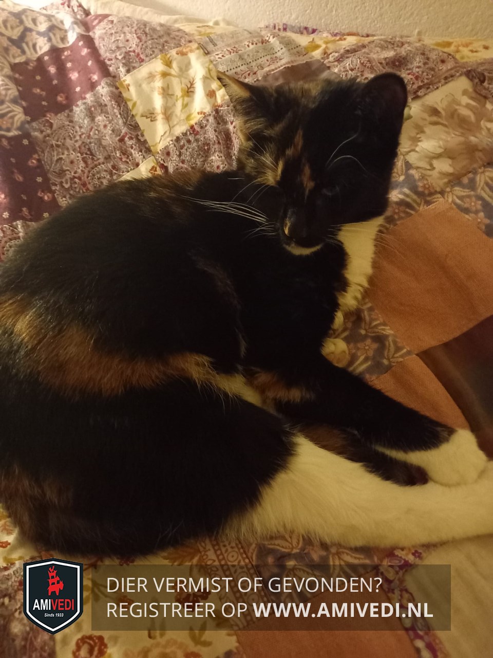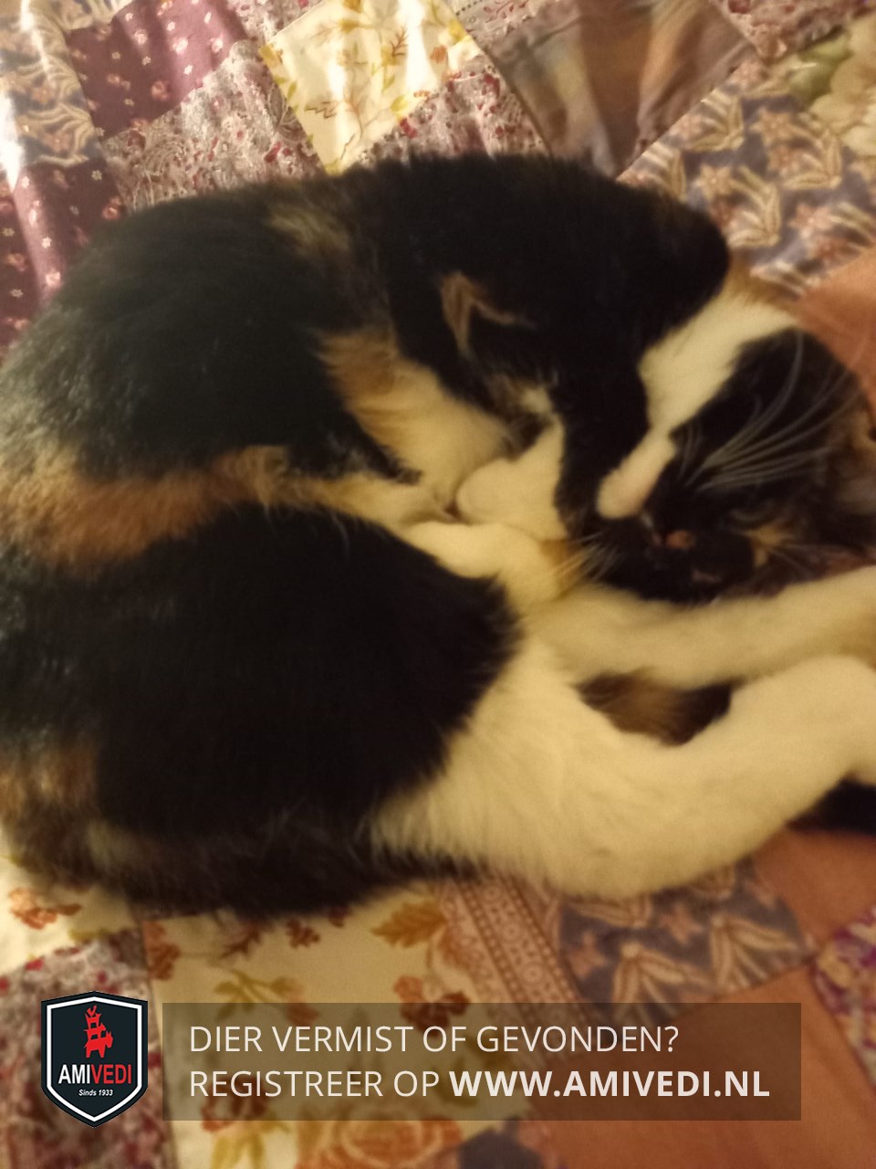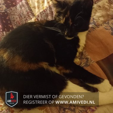 | Signalement | Lapjespoes zwart/rood/oranje met wit, kopje en rug voornamelijk zwart met rood/oranje vlekken, witte kin, witte borst, witte buik, witte voeten voorpoten, witte achterpoten, staart is ingekort met de hechtingen er nog in. |