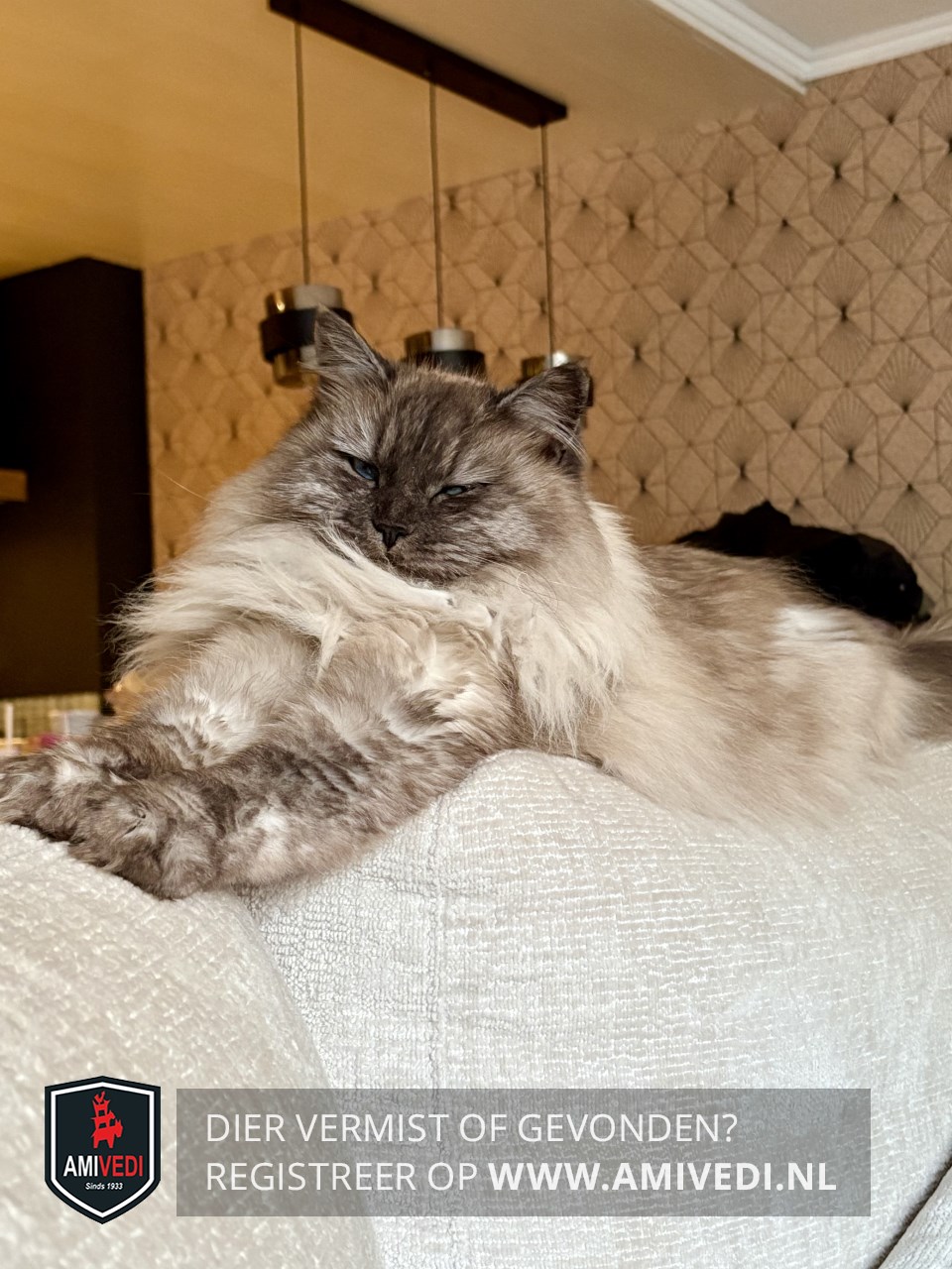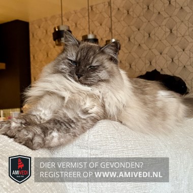 | Signalement | Beige/wit/grijs. Langharig. Grijs op de neus en bles. Lichte (witte) langharige bef. Lichaam beige-wit gemêleerd. Voorpoten grijs gemêleerd. |