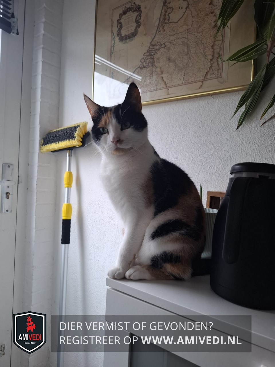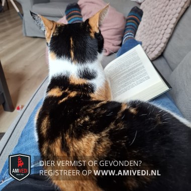 | Signalement | Wit met rood/oranje en zwarte lapjespoes, zwart petje en kraag, een smal rood/oranje streepje over de kraag, linkerkant kop rondom linkeroor en boven linker oog zwart, rechterkant zwart naast rechteroor en ook oranje boven rechter oog, witte neusbrug, witte wangen, linker kant onder de neus een rood/oranje vlekje, rood/oranje vlekje op de kin, witte bef, borst en buik, voorpoten wit, achterpoten ook met wit |