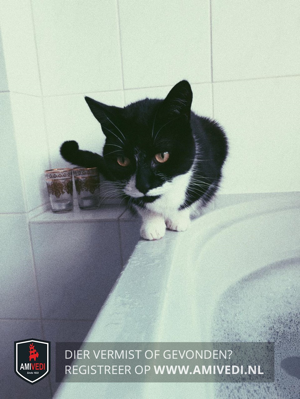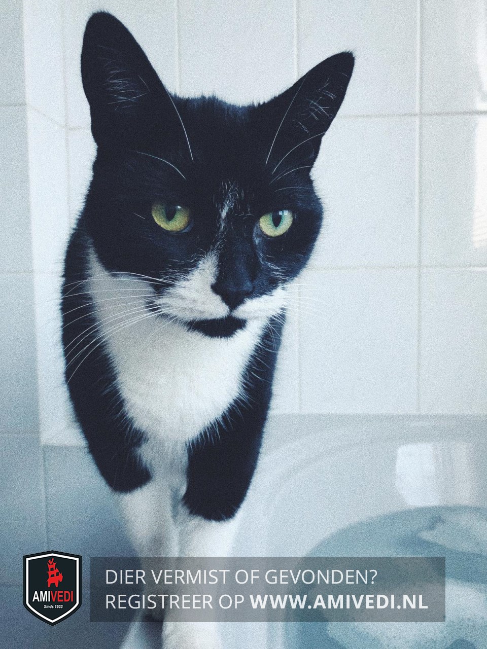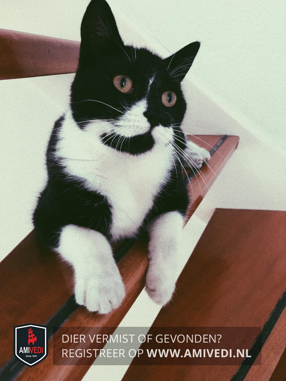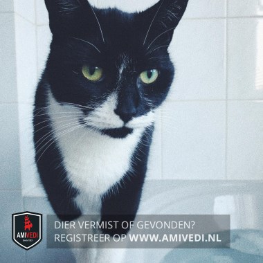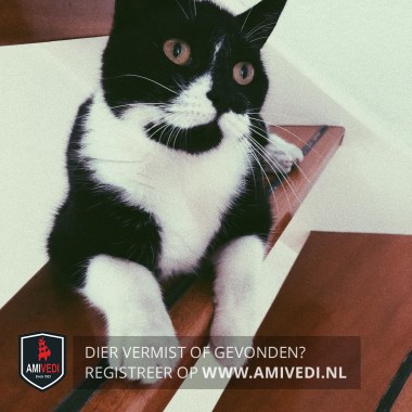 | Signalement | Het is een zwarte poes met witte sokken en een witte nek. Ze heeft een witte streep aan de rechterkant van haar gezicht. Rechts van haar neus is ze wit. andere zijde zwart. |