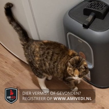 | Signalement | Cypers bruin/grijs/zwarte poes. Puntje van de neus is wit, wit rondo het bekje. Voorpootjes witte teentjes, achterpootjes witte kniekousjes. Bang voor vreemde mense. |