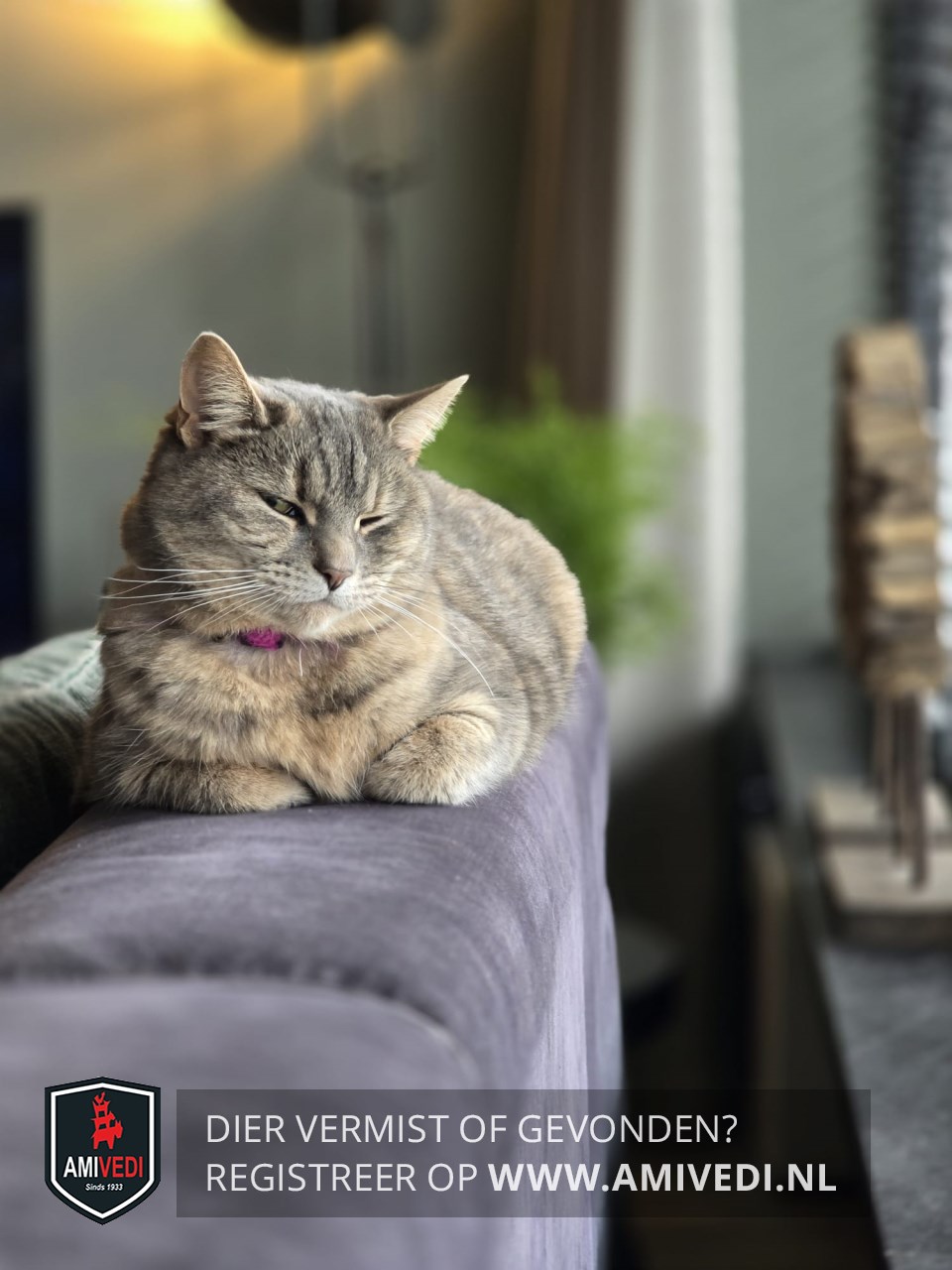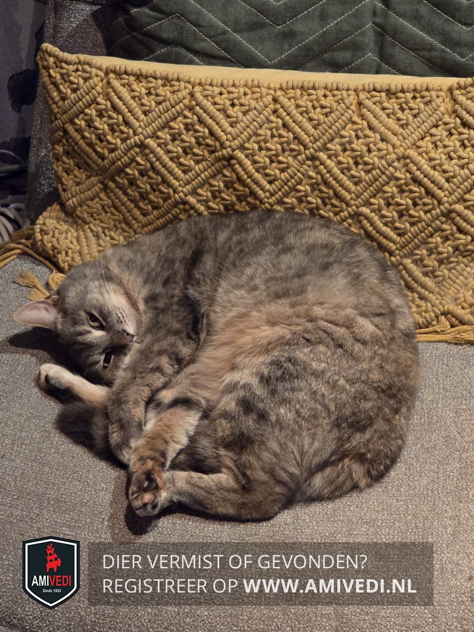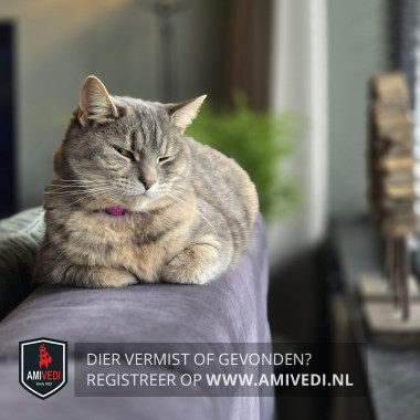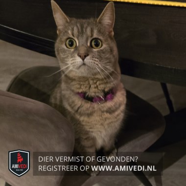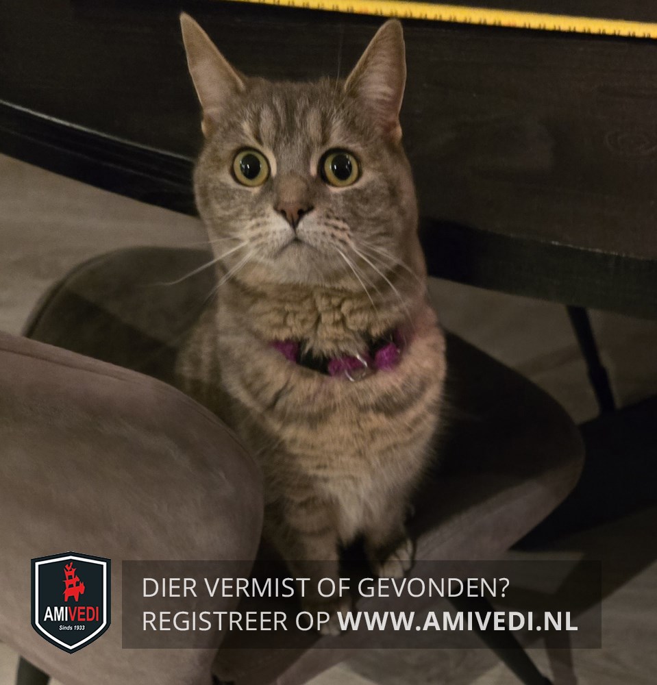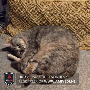 | Signalement | Grijs/beige cyperse poes. Heel licht rondom bekje en onder de kin. Beige borst. Grijs/beige op het lijfje. Op de buik beige/oranje. Roze halsbandje. |