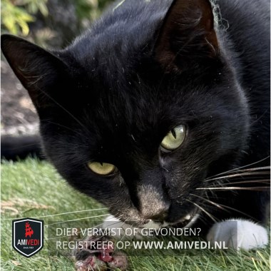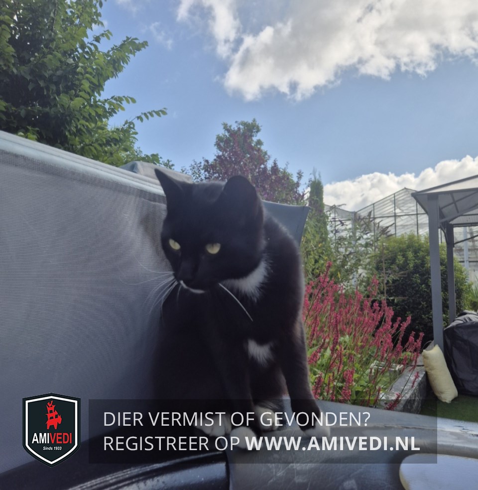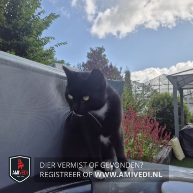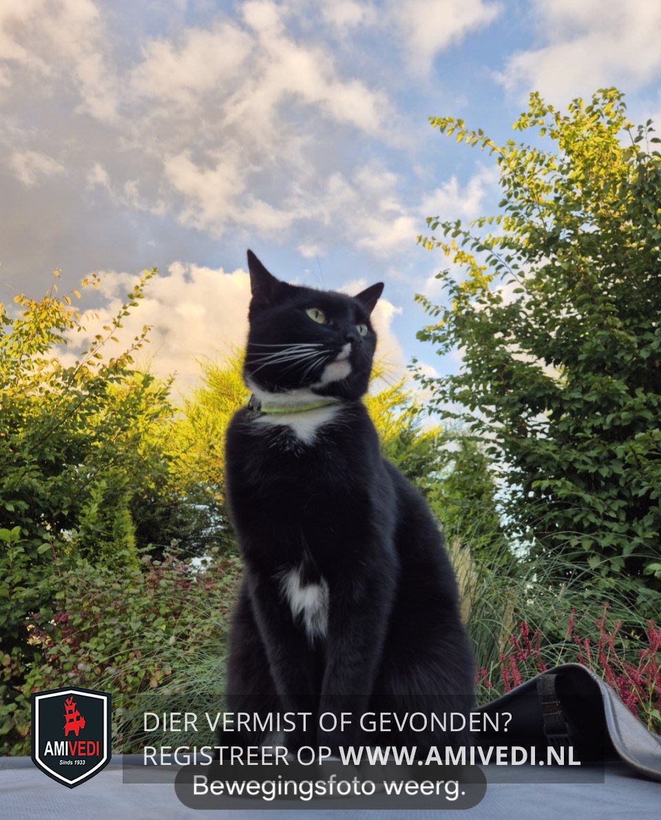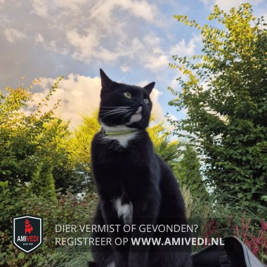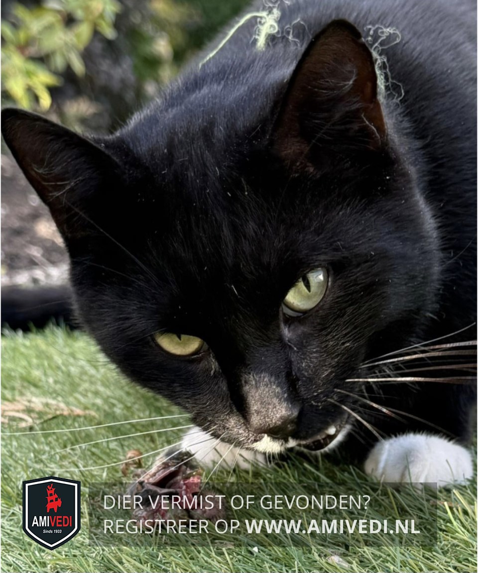 | Signalement | Zwarte kater met witte sokjes, ene kant witte snorharen andere kant zwart, witte streep op snuit. Witte bef. |