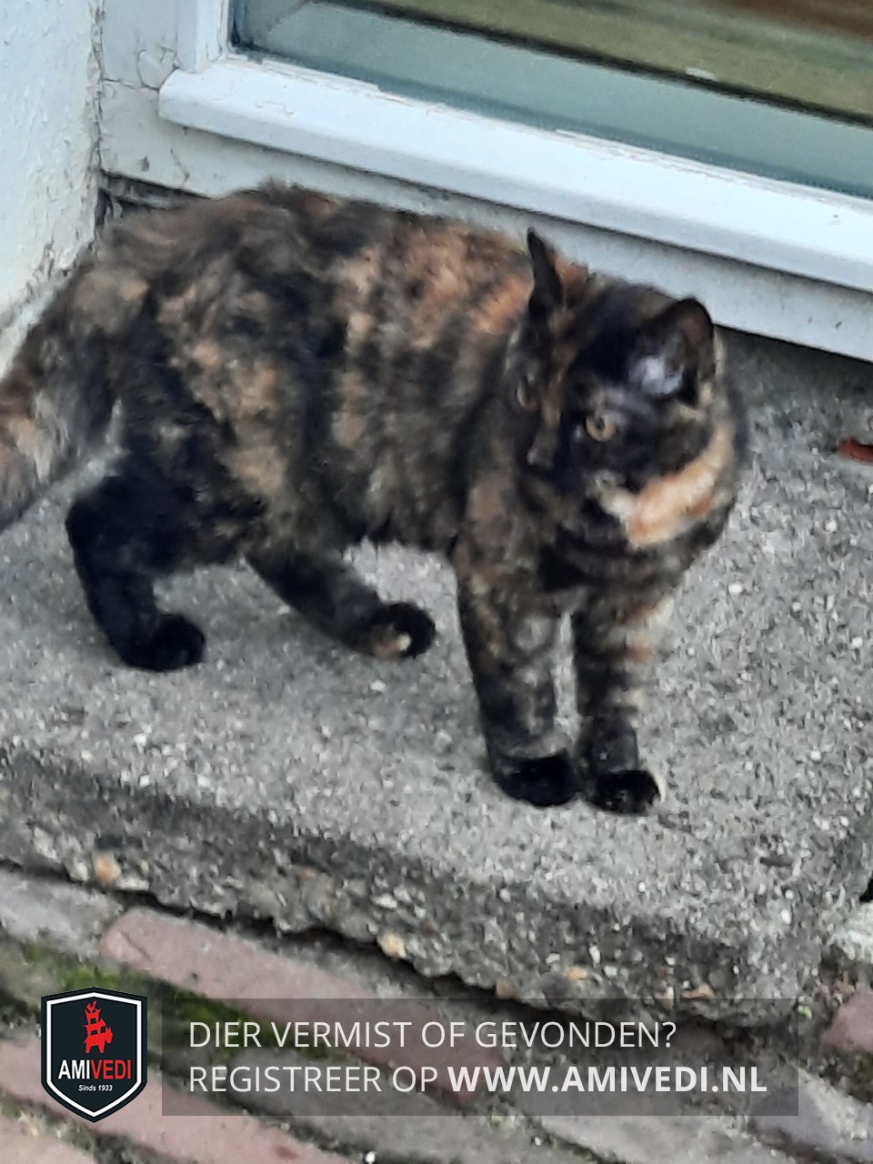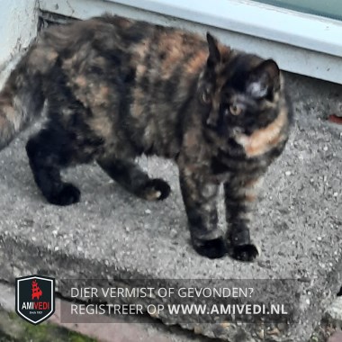 | Signalement | Zwart (bruin)/rood gemêleerde Schildpad, met een rossige vlek bij de bef. Licht krullend haar. Donker kopje met afgebroken snorharen. (vrij kleine kat) |