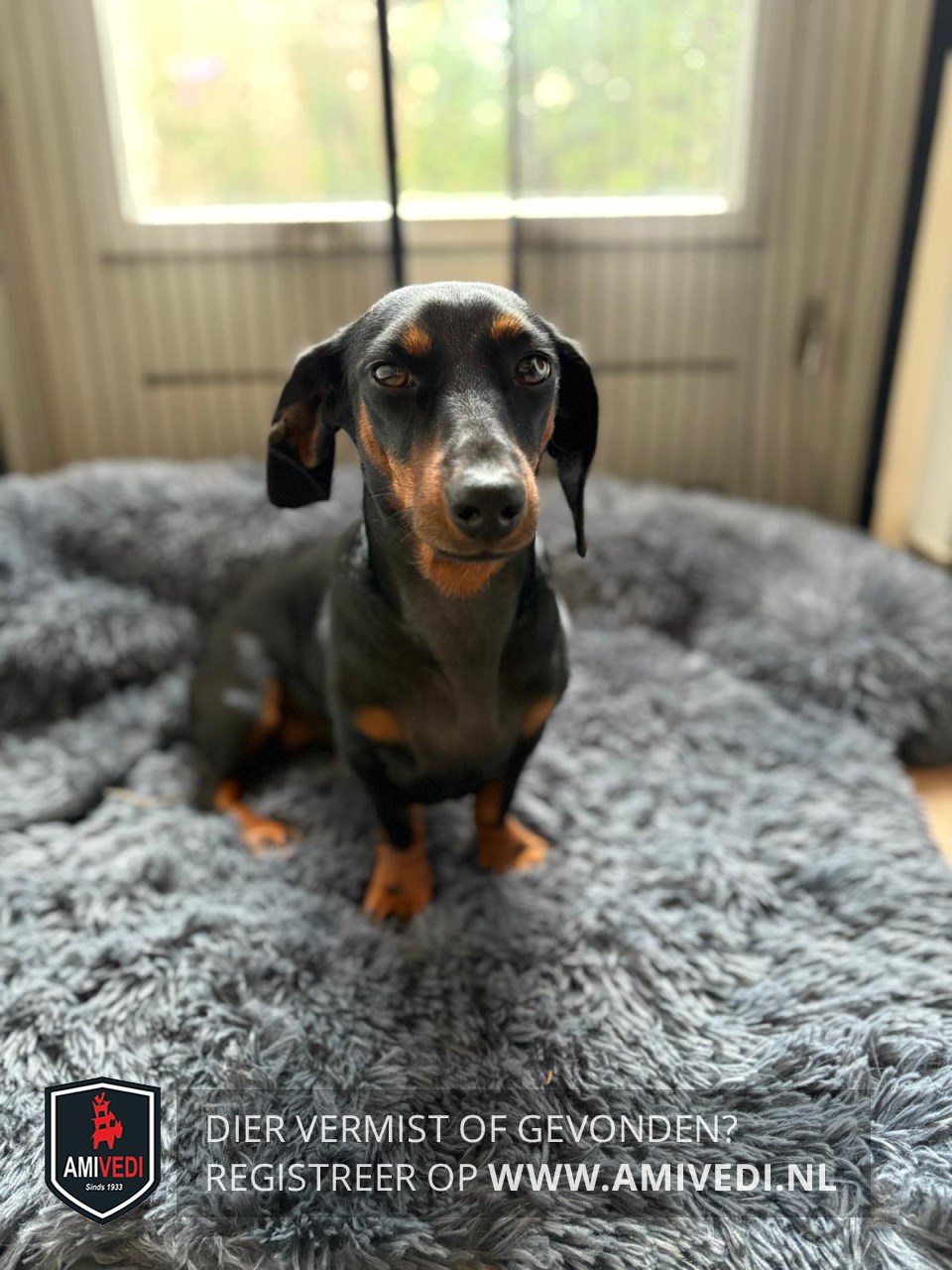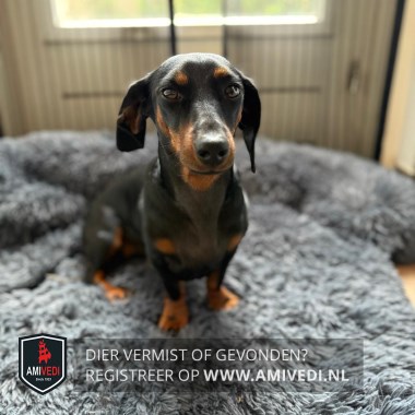 | Signalement | Zwarte Teckel. Bruine plekken boven de ogen, naast de snuit naar de wangen, onder de bek, naast de borst en poten. |