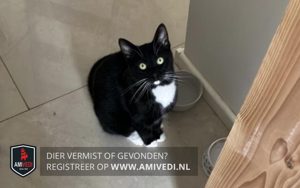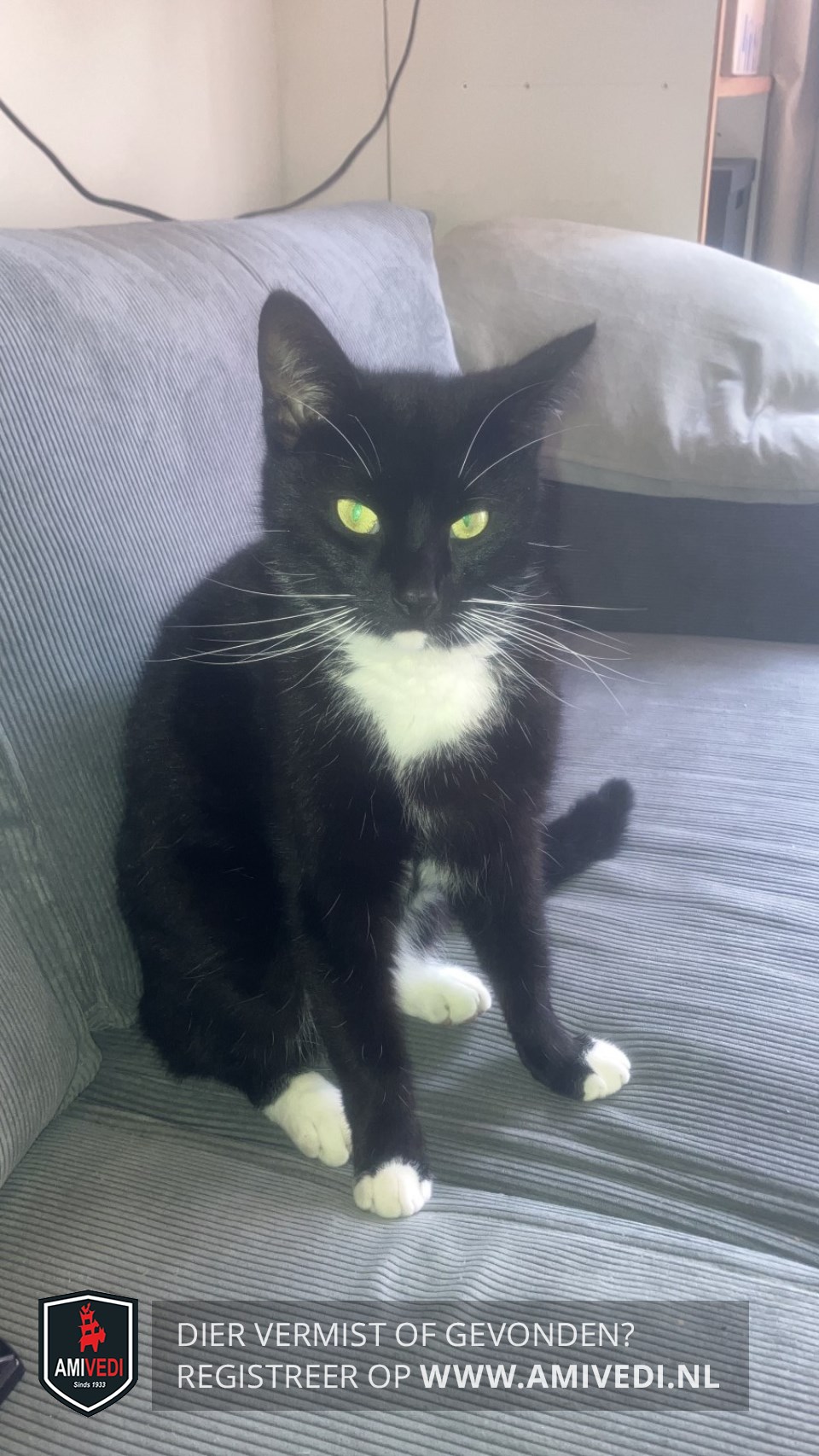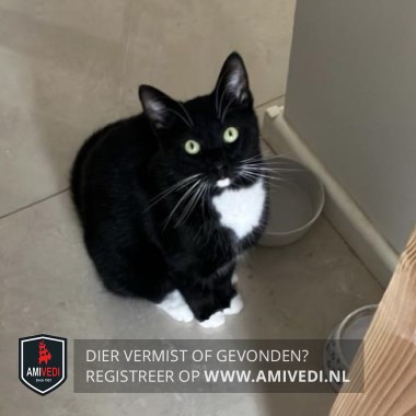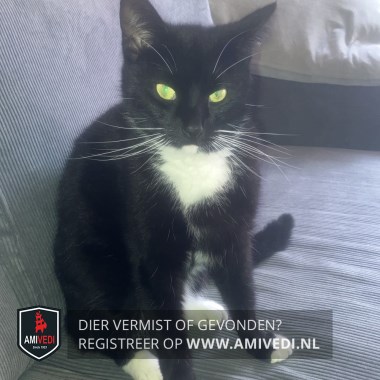 | Signalement | Zwart/wit. Hoofdzakelijk zwart. Witte kin, witte bef en buik. Witte teentjes voorpoten. Witte sokken achter. Zwarte rug, flank en staart. Groengele ogen. |