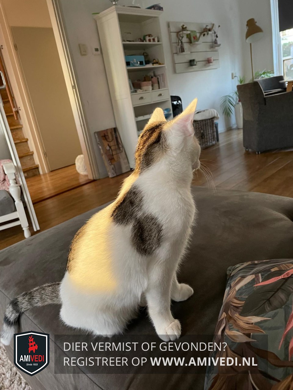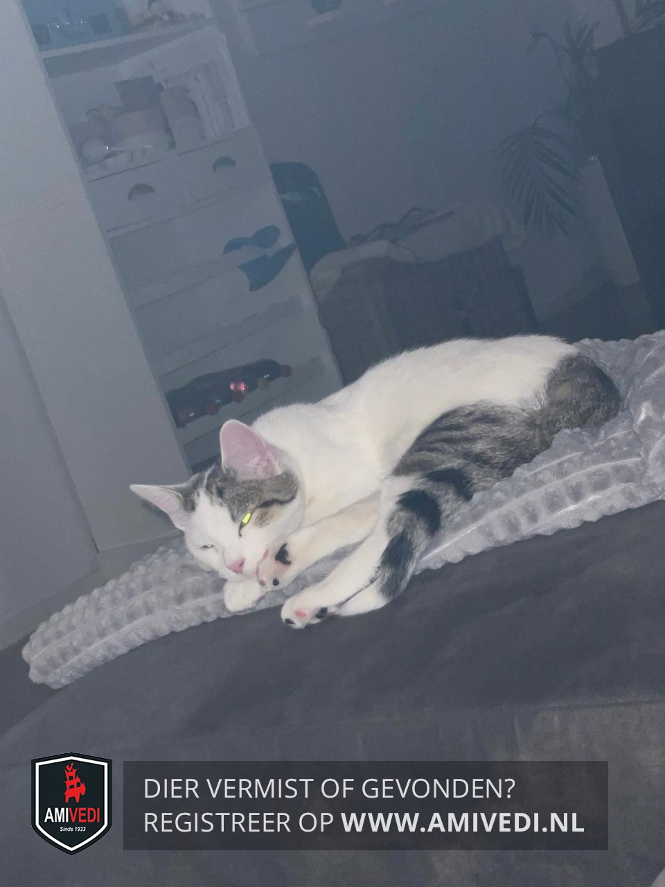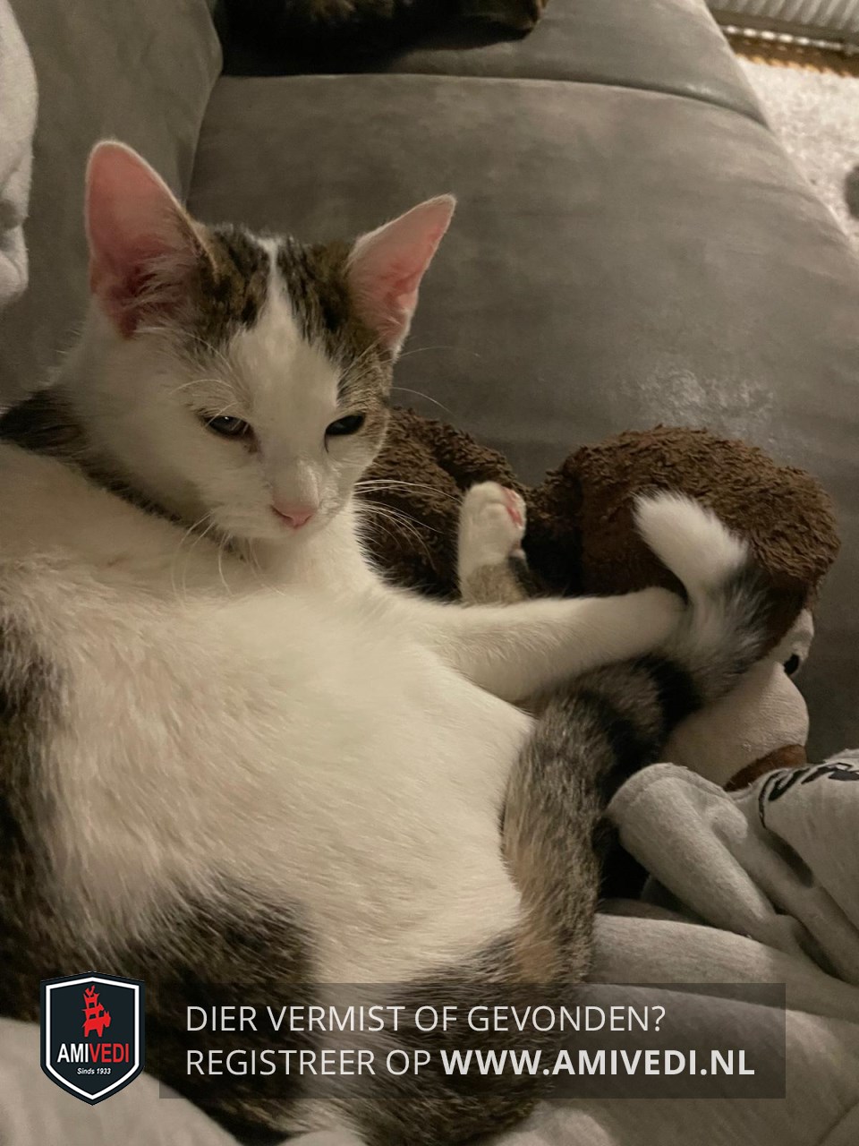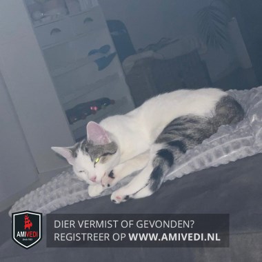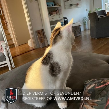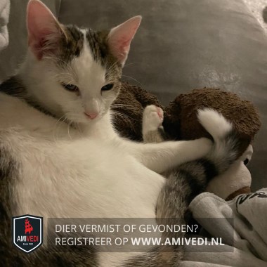 | Signalement | Wit met linkerkant een getijgerde vlek rechterkant is wit De oren zijn wit met een tekening op z’n hoofd Zijn staart is gestreept met een witte punt. |