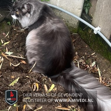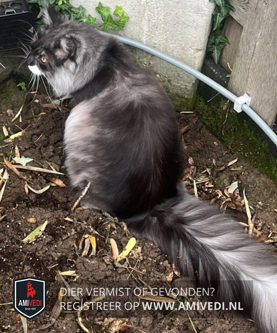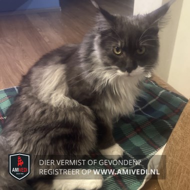| Signalement | Langharig, grotendeels grijs/zwart, witte bef, kin, kraag en borst, witte voetjes, staart zwart met wit. |