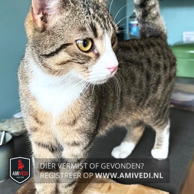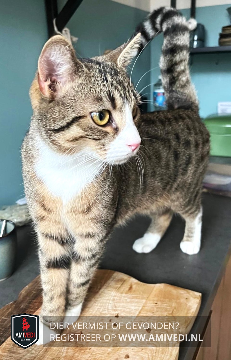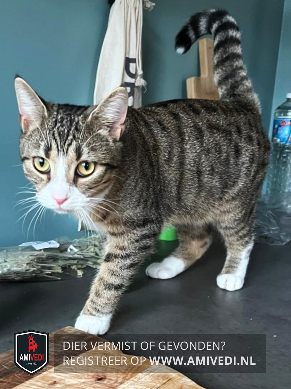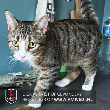 | Signalement | Cypers bruinzwart gestreept met wit. Voornamelijk cypers bruin, boven de ogen opstaande zwarte en beige streepjes, rond ogen beige randjes, witte streep over de neus, witte snoet, roze neusje, onder neusje en kin wit, witte bef, voorpoten witte voetjes, achterpoten witte sokken, bij het linker achterpoot loopt het wit aan de zijkant omhoog tot de hak, staart cypers geringd met een zwarte staartpunt, op het uiterste puntje van de staart een witte stip. |