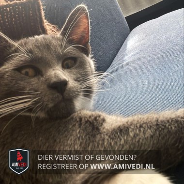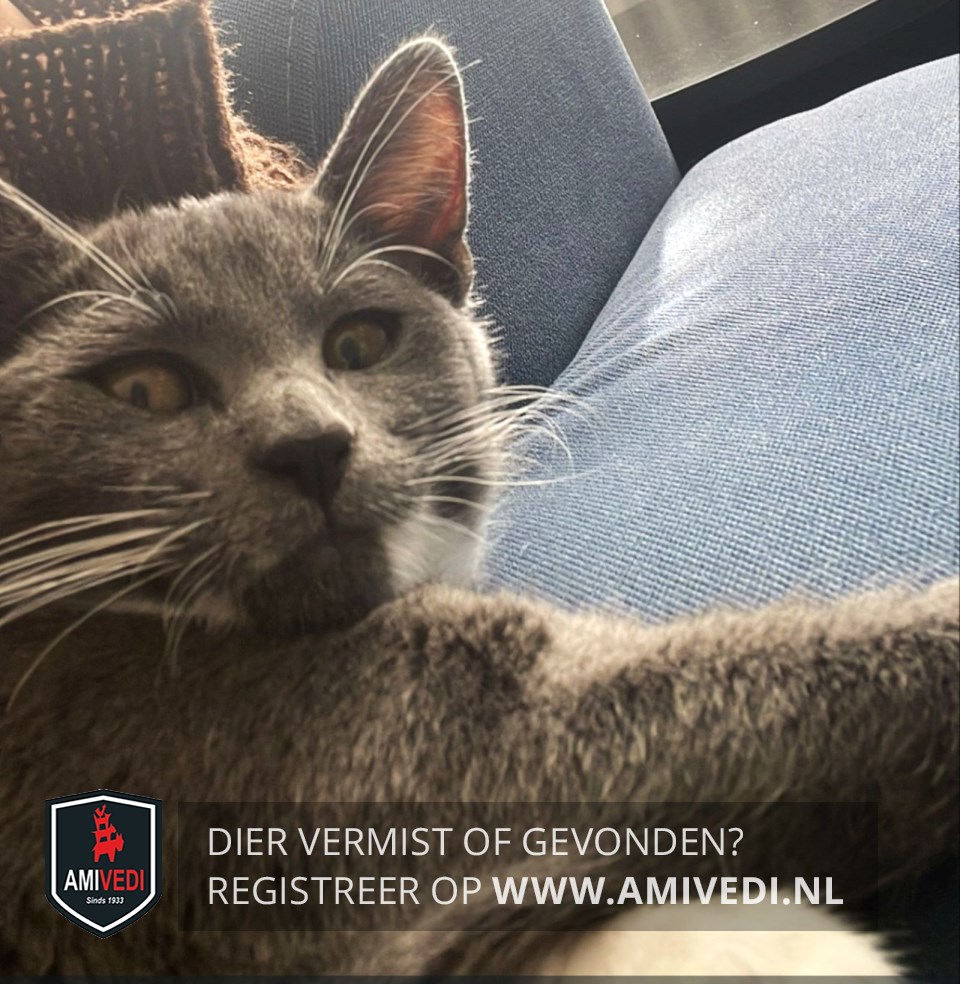 | Signalement | Grijs met wit. Voornamelijk grijs, donkergrijs neusje, links naast de kin wit, witte sok aan de linker voorpoot. |