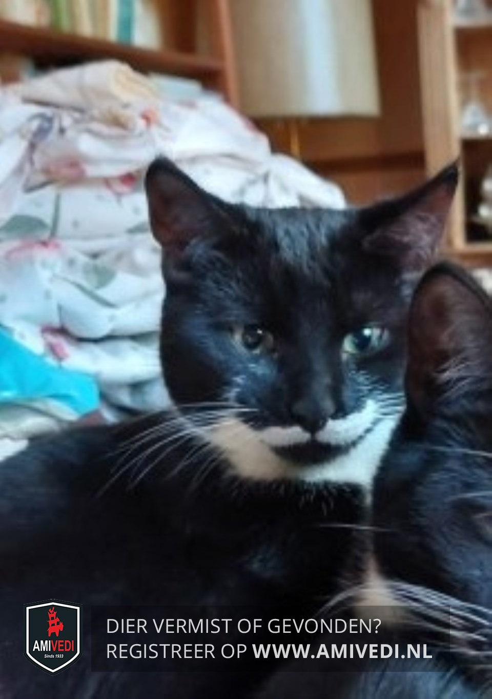 | Signalement | Zwart met witte snor, kin en bef, wat wit op buik, witte sokjes. Volop snorharen. |