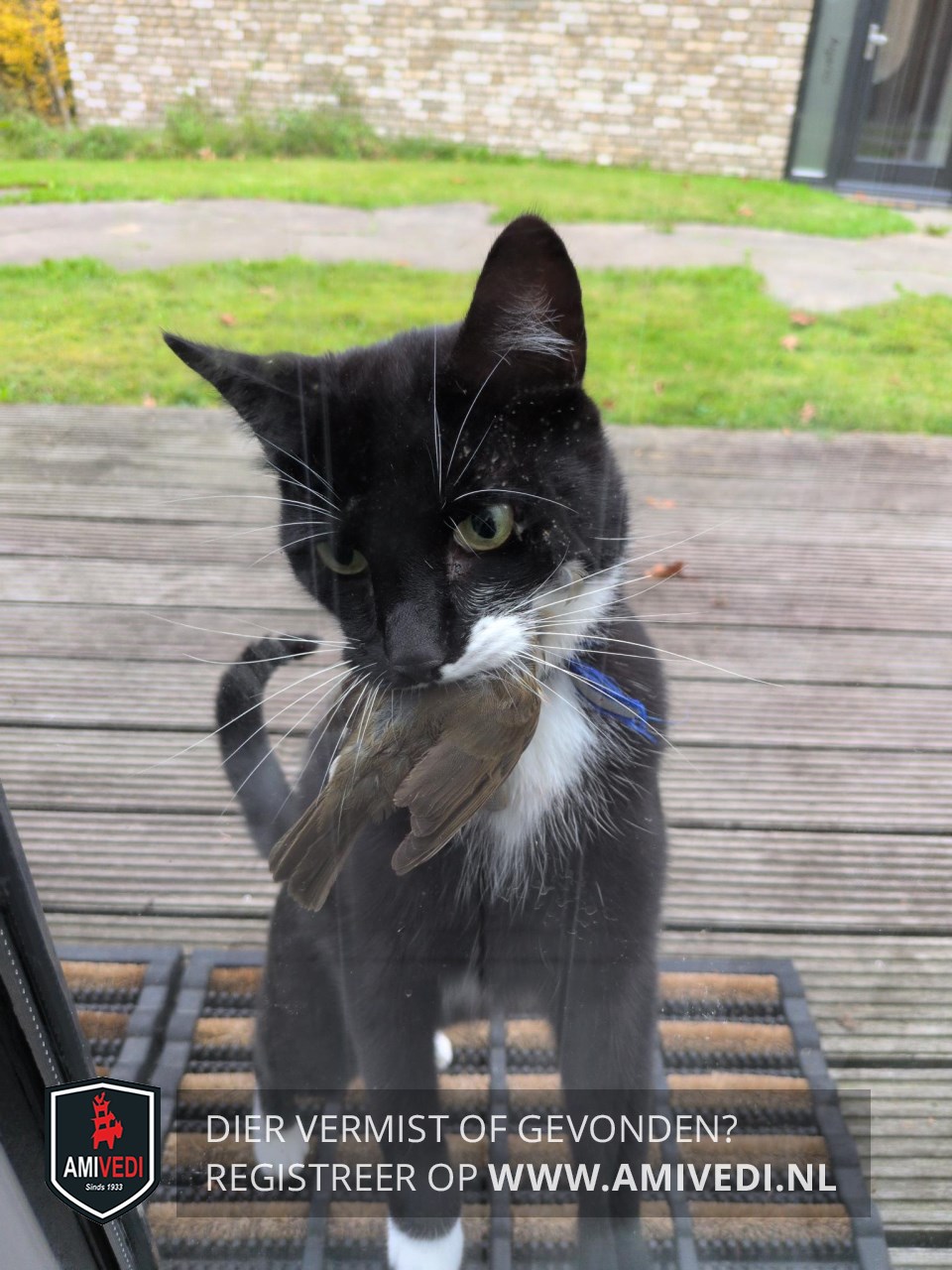| Signalement | Zwart met linker bovenlip wit, witte kin, bef, borst en buik, witte voetjes. |