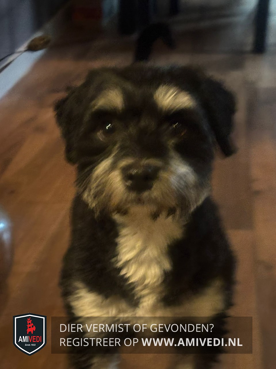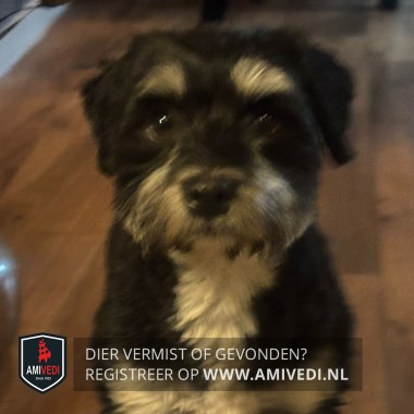 | Signalement | Dwerg Schnauzer / terriër. Zwart kopje, beige wenkbrauwen, bekje en bef. |