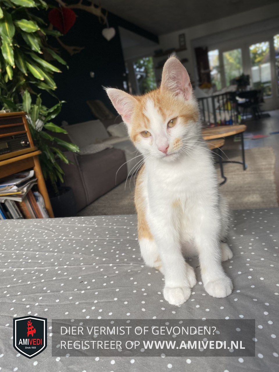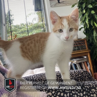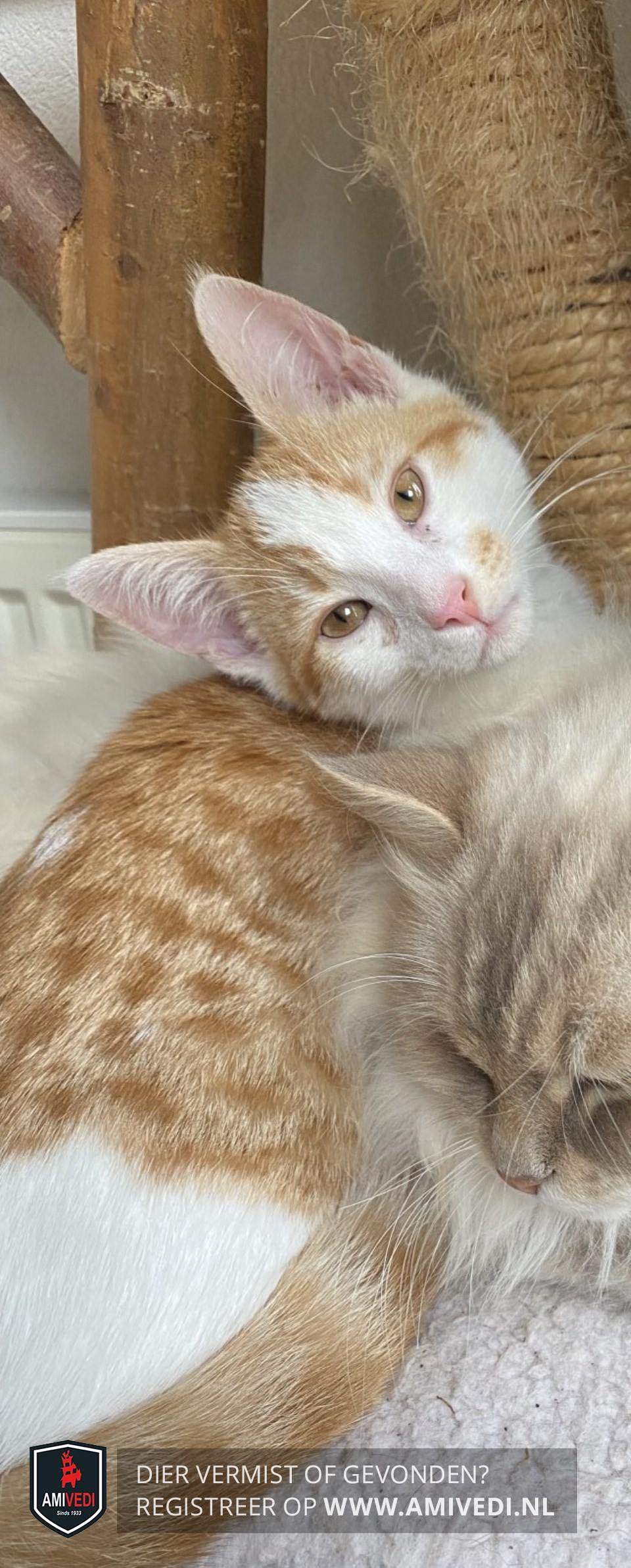 | Signalement | Cypers rood met wit, rode oren en petje loopt aan weerszijden van het kopje door, witte bles en snuit met rood vlekje links naast de neus, witte kin loopt door tot onderaan de voorpoten, binnenkant linker voorpoot klein rood streepje, achterpoten wit met cyperse vlekken, cyperse rug en staart. |