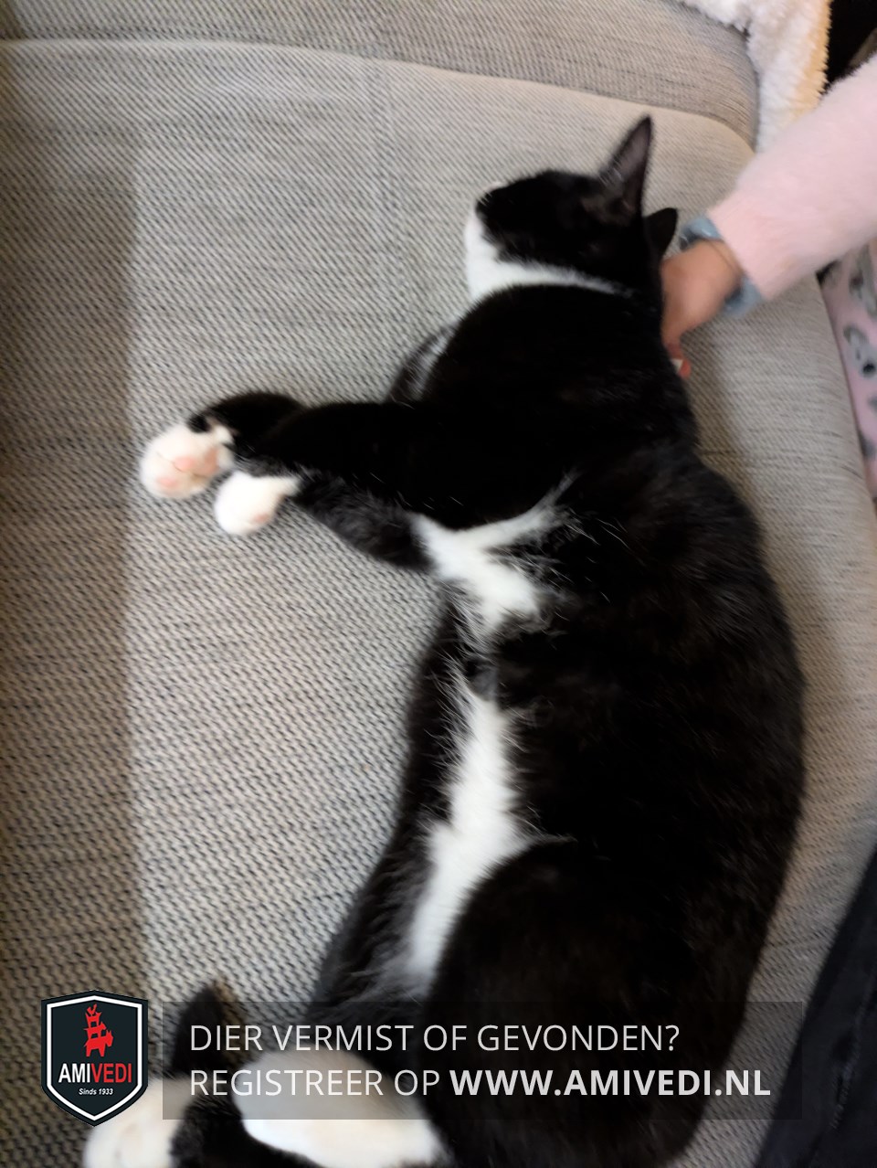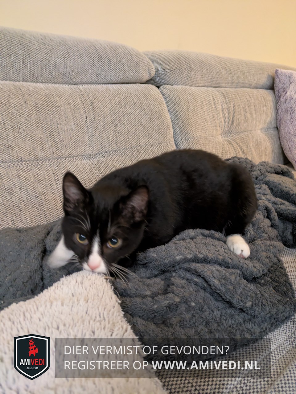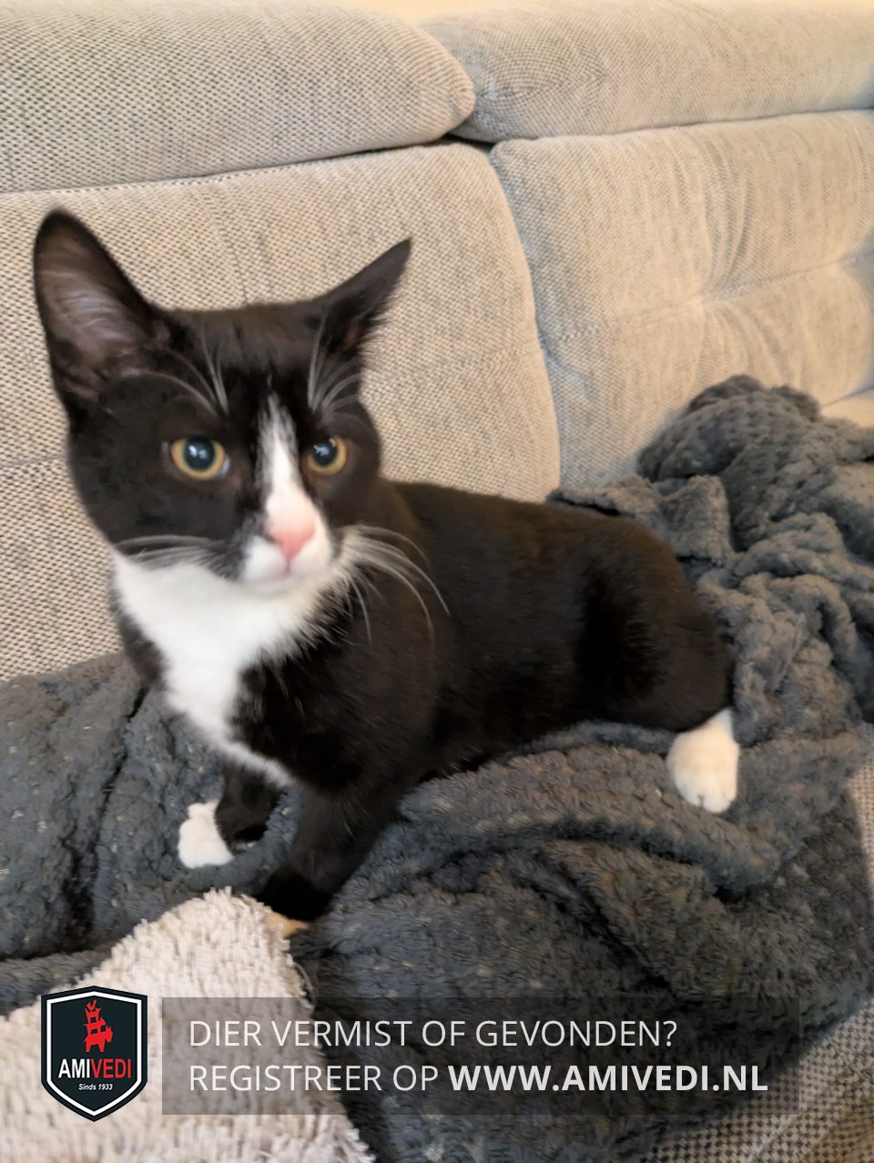 | Signalement | Zwart met wit streepje tussen de ogen en witte snuit, witte kin, bef, borst en buik, voorpootjes witte voetjes, achterpootjes witte sokjes. |