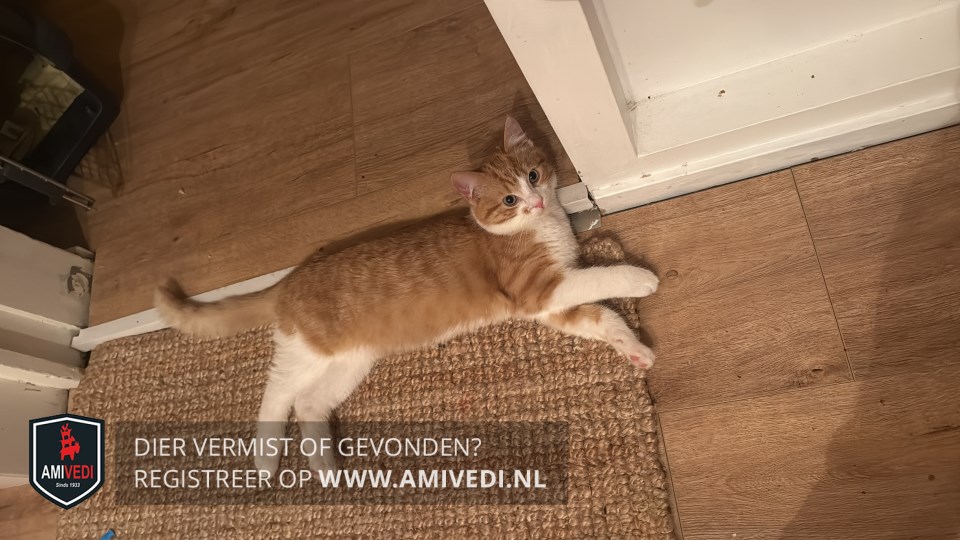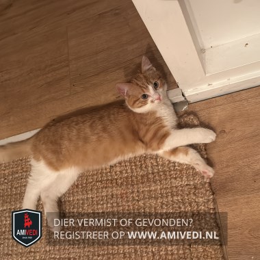 | Signalement | Kitten (m). Cypers rood/oranje. Neusbrug wit, wangen en snuit. Witte borst en buik. Witte poten, op de linker voorpoot een plek rood/oranje. Rechts naast de neus een rood/oranje plekje/stipje. |