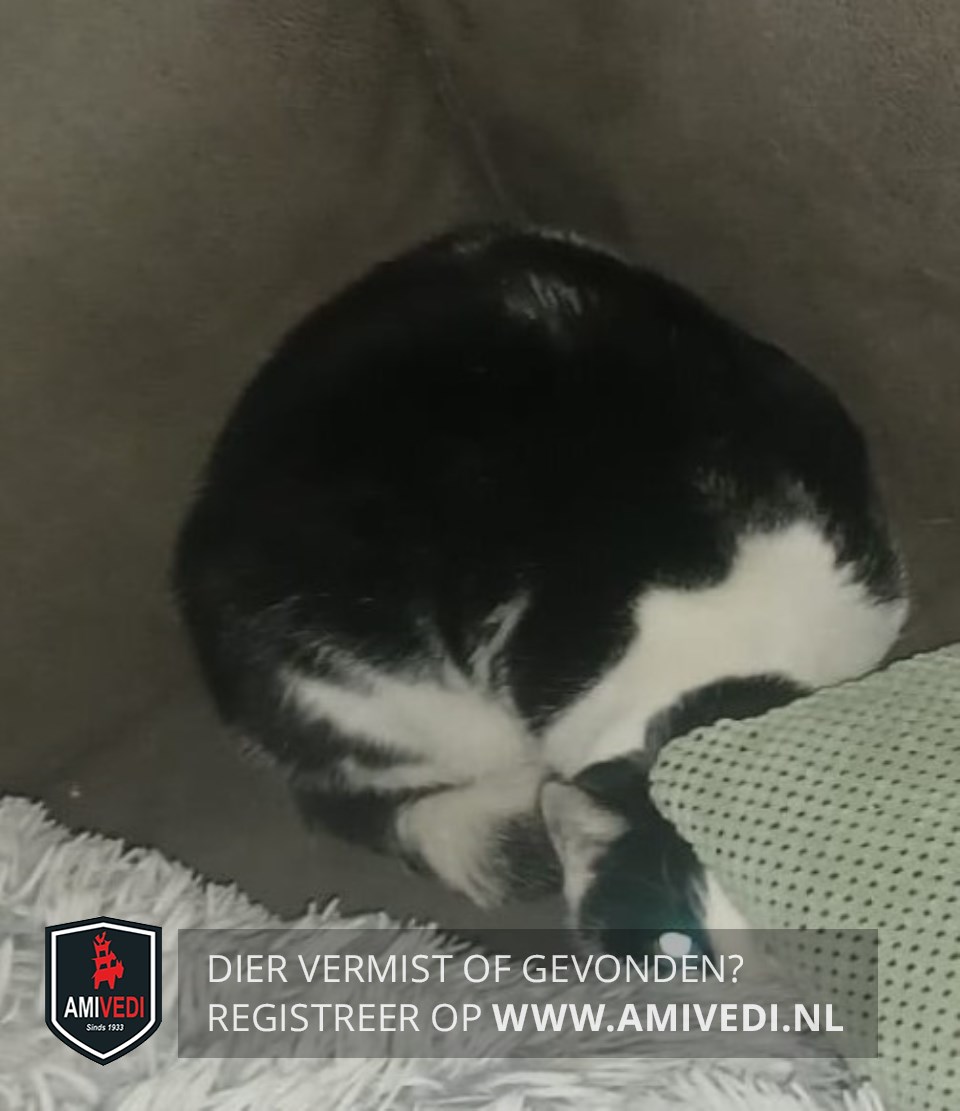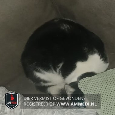 | Signalement | Zwart petje en rug. Witte bles net onder de kraag een witte band en bij de buik en achterpoten lijkt het wit. |