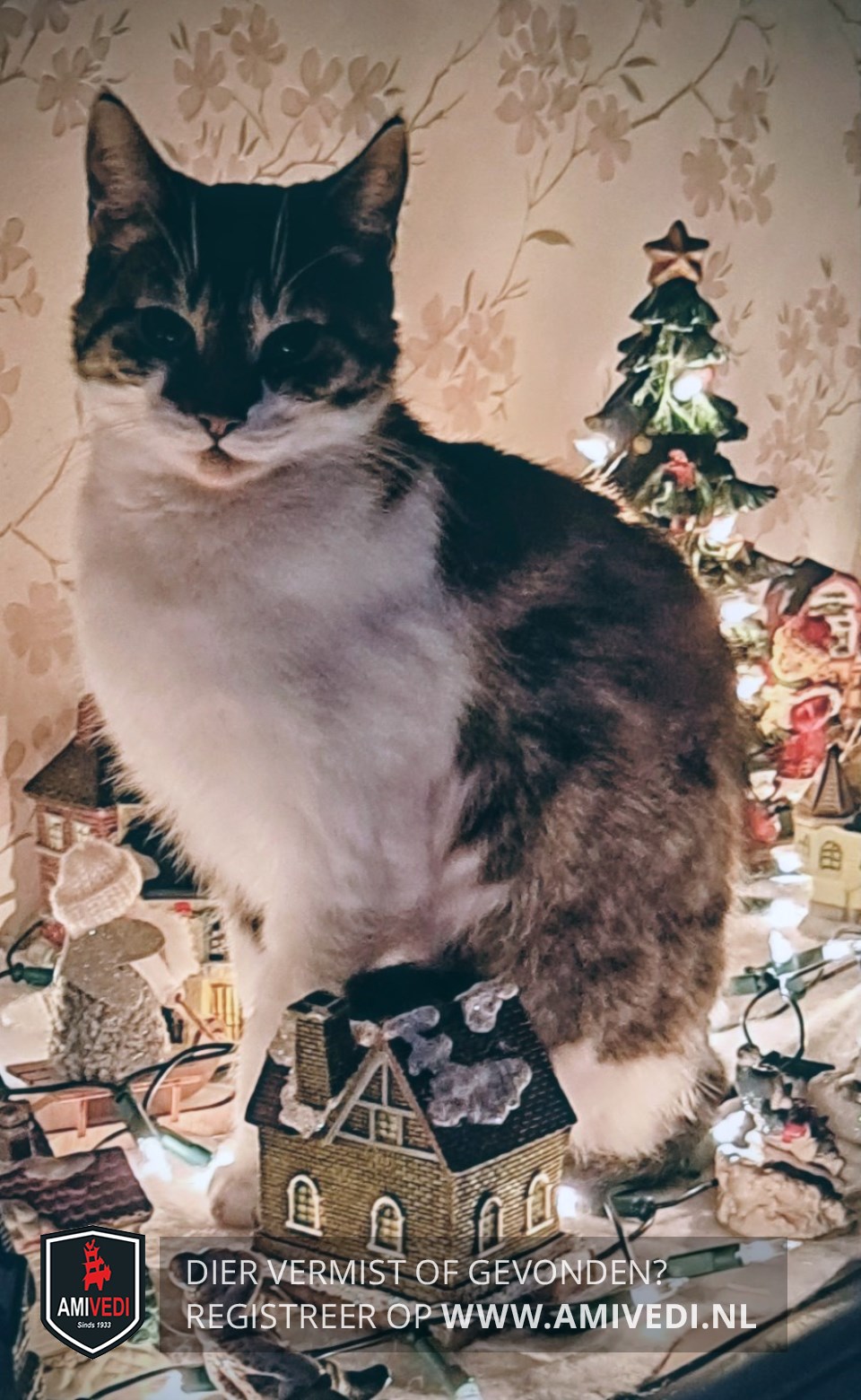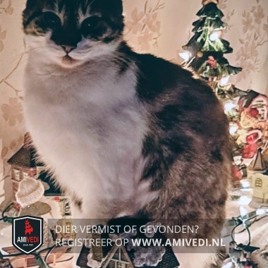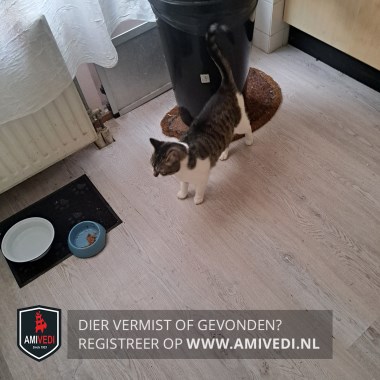 | Signalement | Bruin zwart gestreepte poes met wit aan de boven ooghoeken en een witte snuit en bek, witte onderkant en witte pootjes. Het lijfje is bruin zwart cypers gestreept, ook het kopje en staart. |