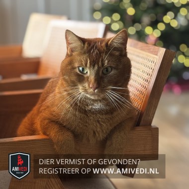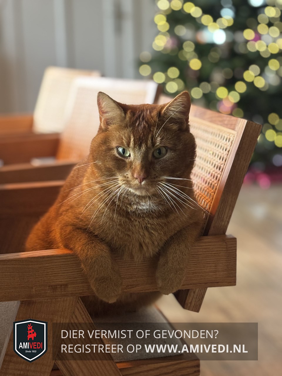 | Signalement | Oranje kat. Einde van zijn staart wit puntje en paar witte haartjes op zijn borst en op zijn snoet. |