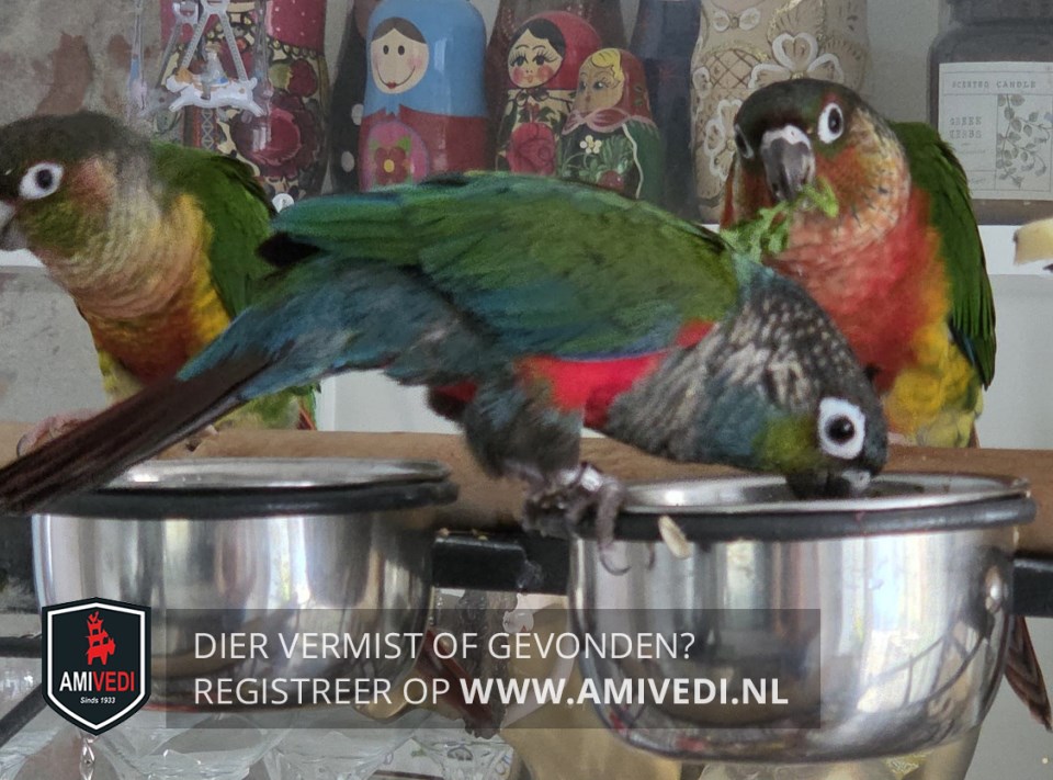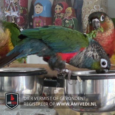 | Signalement | Grijs met groen en rode/blauwe Pyrrhura, grijze kop, groene kin, blauwe keel, rode borst en flank/buik, groene rug, heeft ook blauwe accenten in de vleugels en vleugelstreep, staart met blauw en grijs |