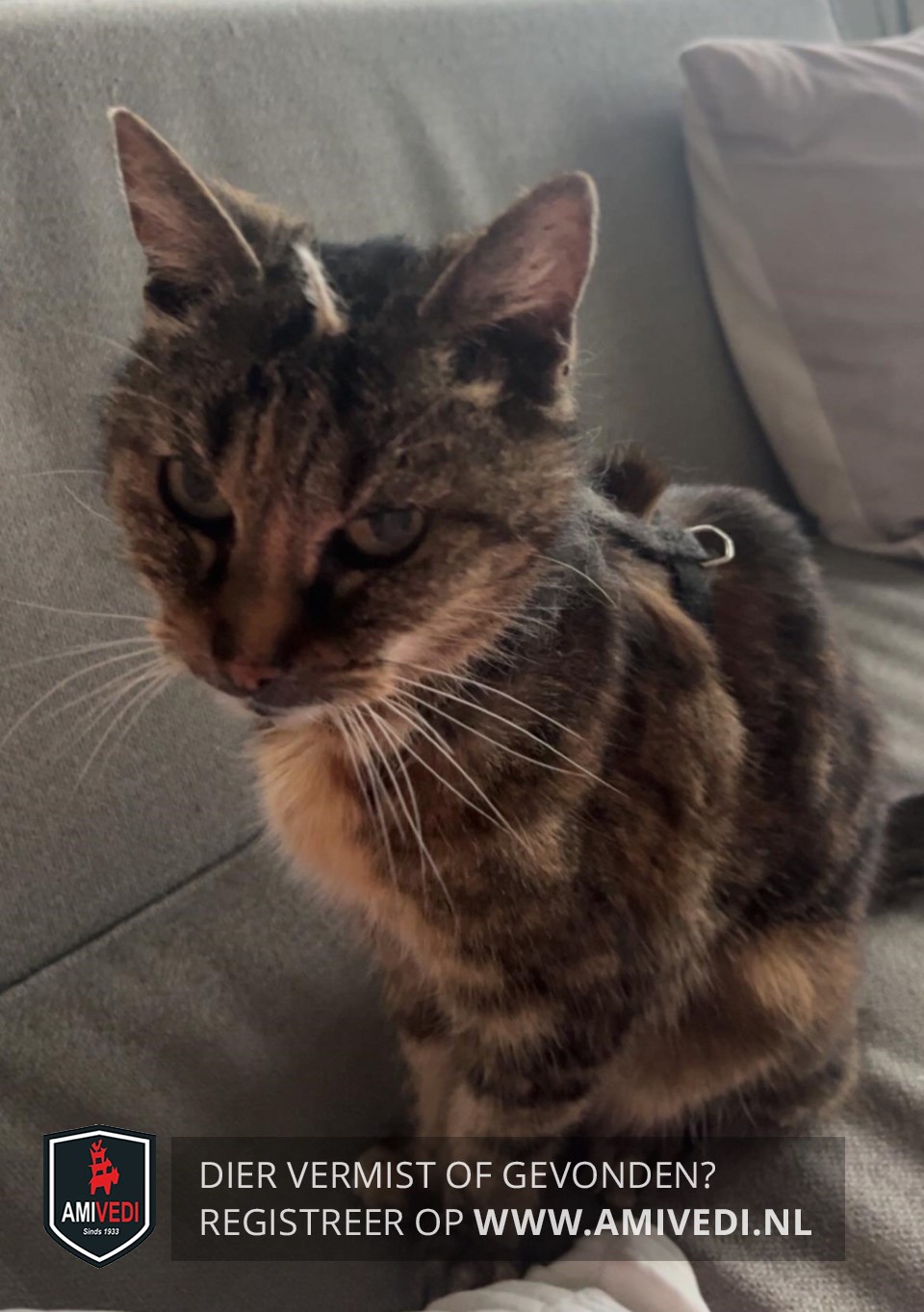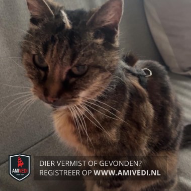 | Signalement | Bruin zwart grijs gemêleerde Britse korthaar met wat wit rondom de bek, draagt een zwart tuigje. |
